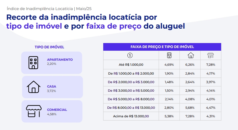 No cenário nacional, nos imóveis residenciais a maior taxa de inadimplência foi na faixa de aluguel acima de R$ 13.000,00 (6,25%) – o maior índice desde junho de 2024, enquanto a menor foi de imóveis de R$ 2.000,00 a R$ 3.000,00 (1,87%). Já em relação aos imóveis comerciais a faixa até R$ 1.000,00 trouxe a maior taxa (7,28%), e a menor foi na faixa de R$ 2.000,00 a R$ 3.000,00, de 3,97%.