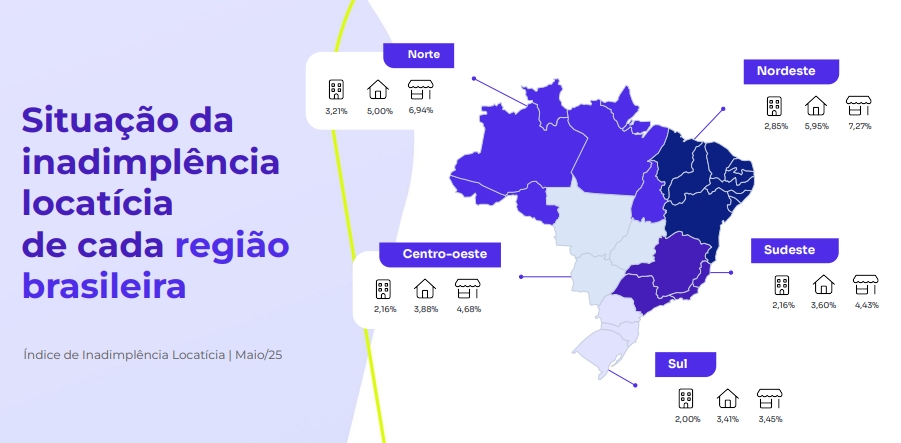 Em maio, a região Norte voltou a figurar no topo do ranking, com uma taxa de inadimplência de 4,77%, após queda em abril (4,45%). A região Nordeste fechou em 4,68%, após ficar em primeiro lugar em abril (4,55%), à frente do Norte. Sudeste vem logo em seguida com taxa de 3,13%, ultrapassando o Centro-Oeste (3,12%), que estava em terceiro lugar desde novembro de 2024. A região Sul segue com a menor taxa do país, 2,70%.