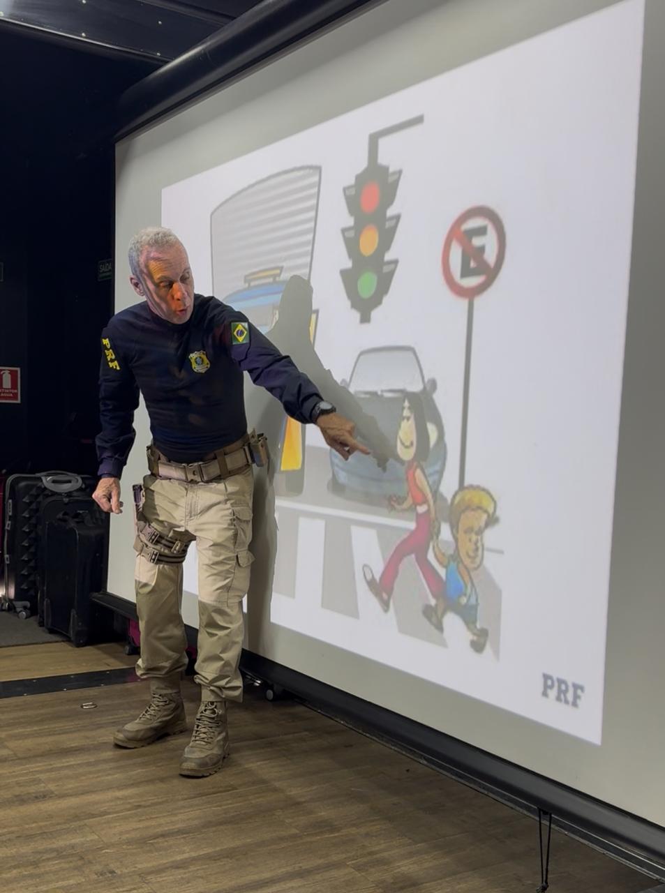 No espaço interativo, conhecido como Cinema Rodoviário, os estudantes assistiram a vídeos e participaram de dinâmicas que abordaram temas essenciais como o uso do cinto de segurança, a importância de respeitar a sinalização e a prevenção de acidentes. As sessões tiveram duração de 50 minutos, com cinco horários diários.