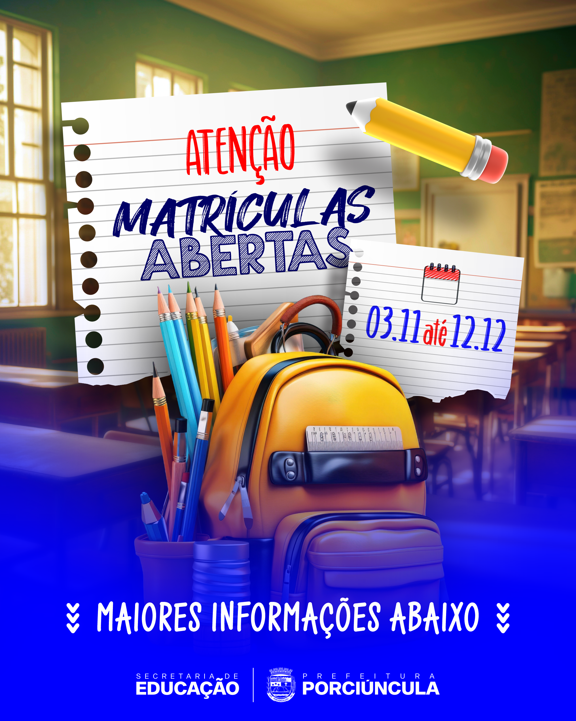 A Secretaria Municipal de Educação tem um recado muito importante para os porciunculenses: Estão abertas as matrículas para a educação infantil, ensino fundamental e EJA, nas escolas públicas municipais.