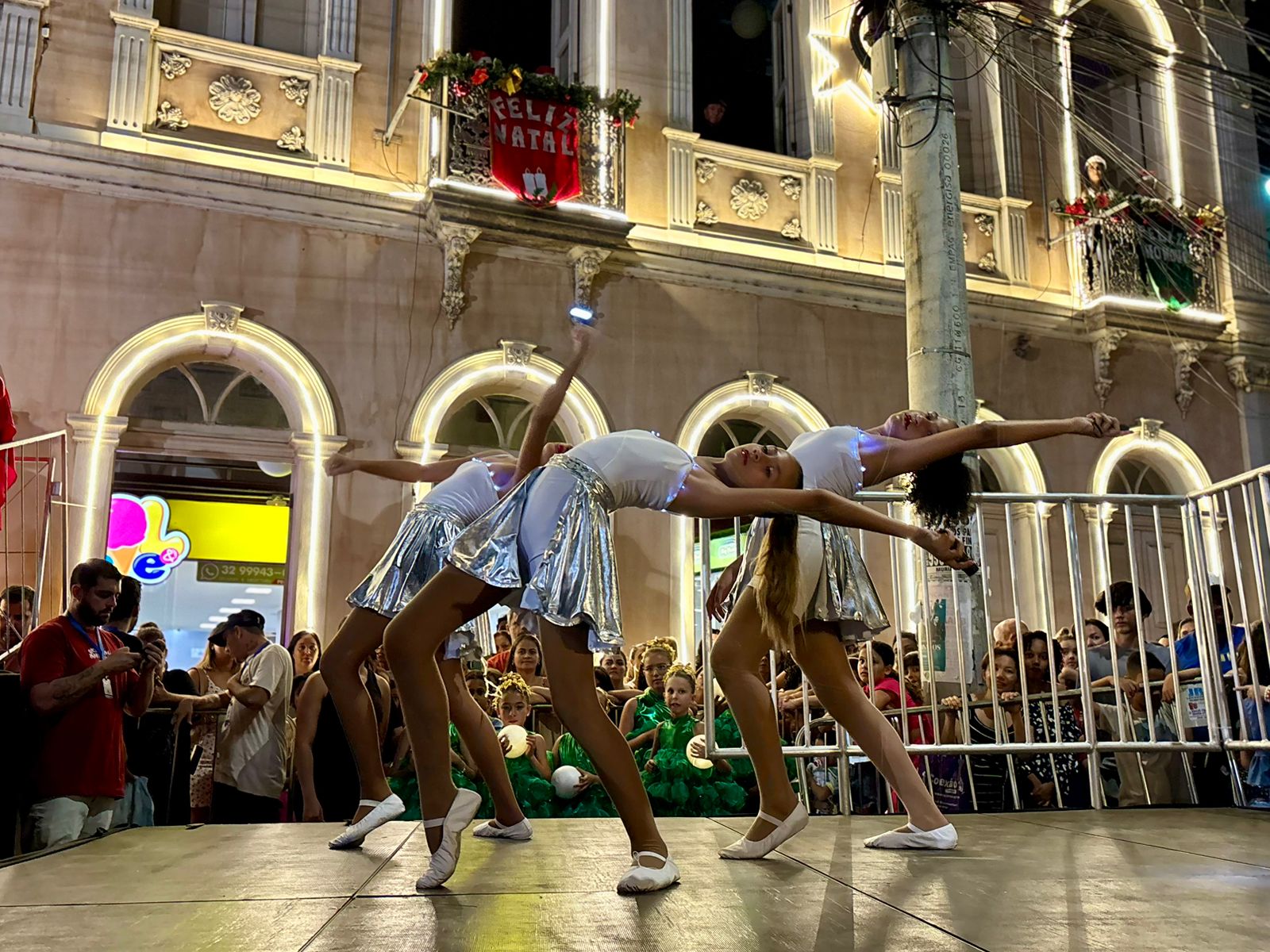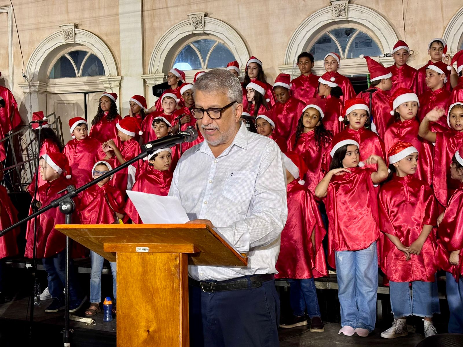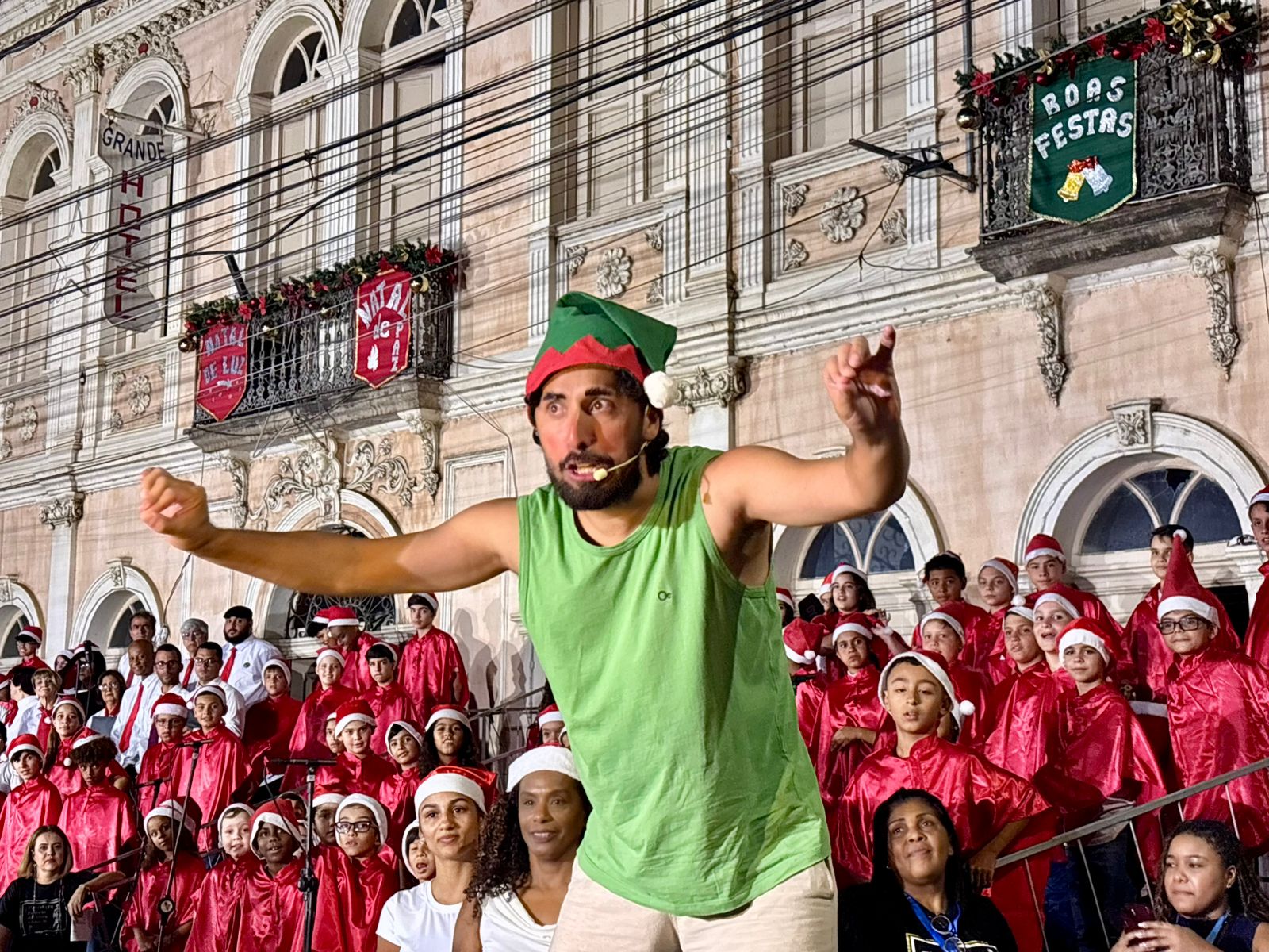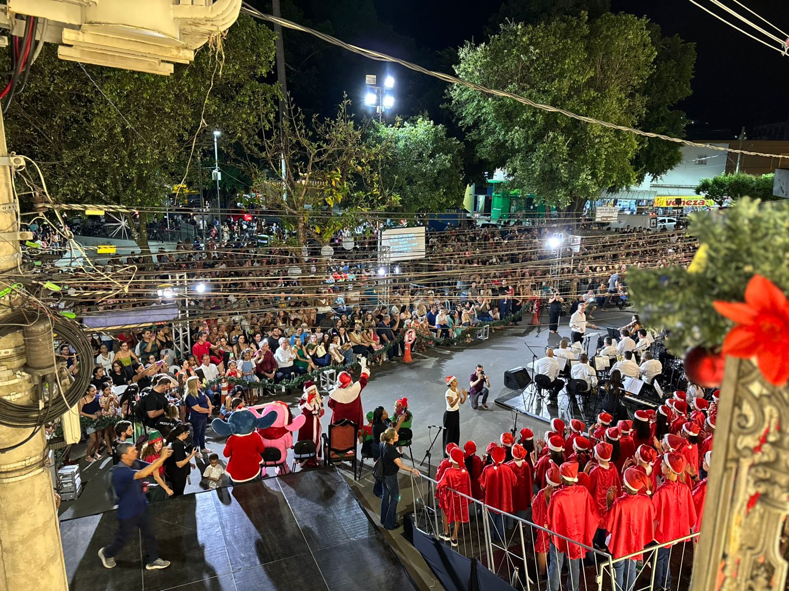 A programação artística iniciou com apresentações da Sociedade Musical União dos Artistas, do Coral Cantare e de um grande coral formado por alunos da Escola Municipal de Música Leonel Vargas, sob regência dos maestros Gidson Cerqueira e Renata Roriz. Mais de 300 crianças, de três escolas de arte, música, dança e teatro, participaram do espetáculo, interpretando clássicos natalinos e emocionando o público presente.
