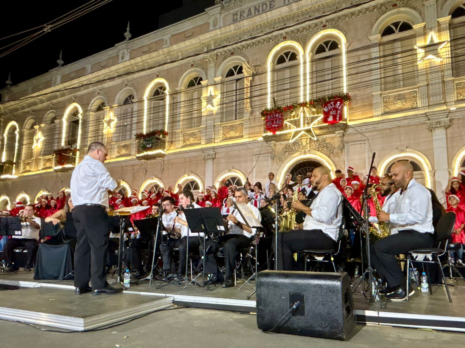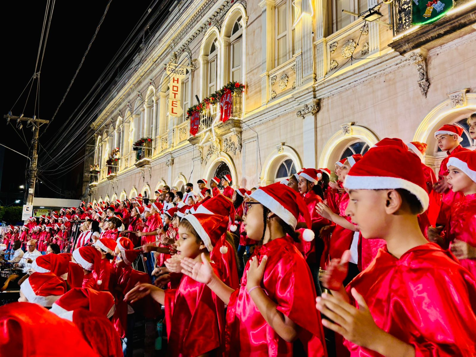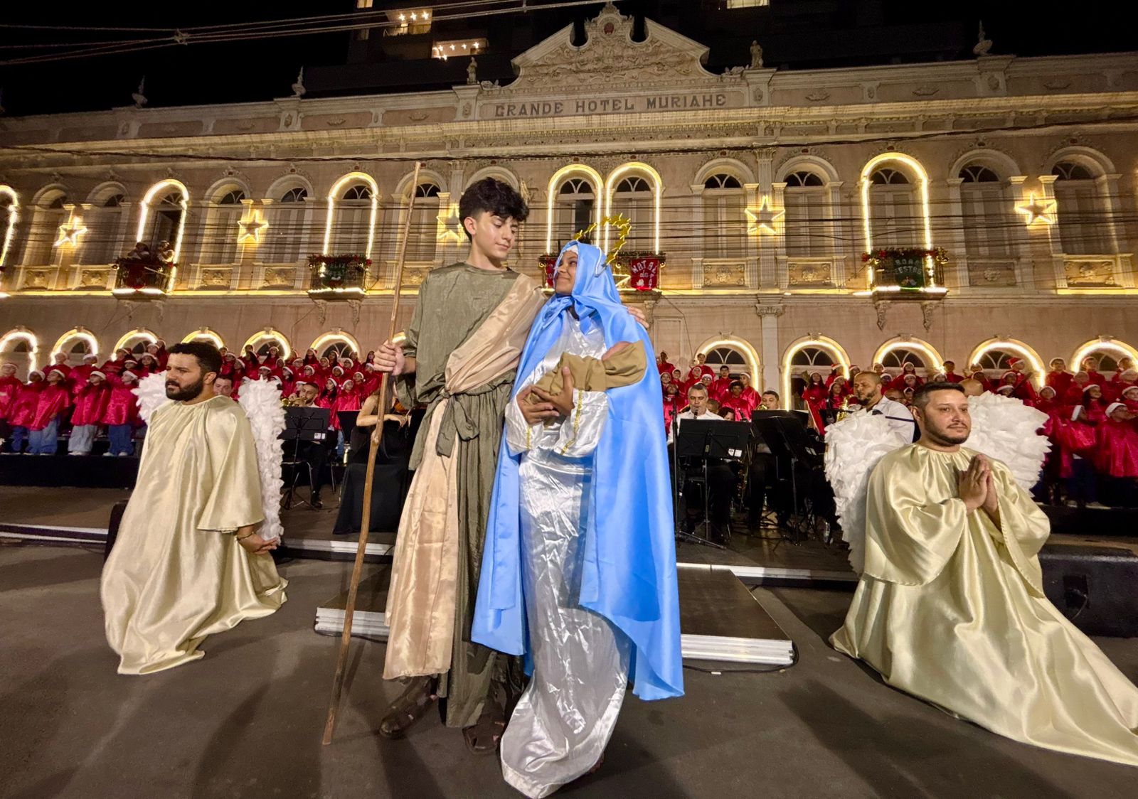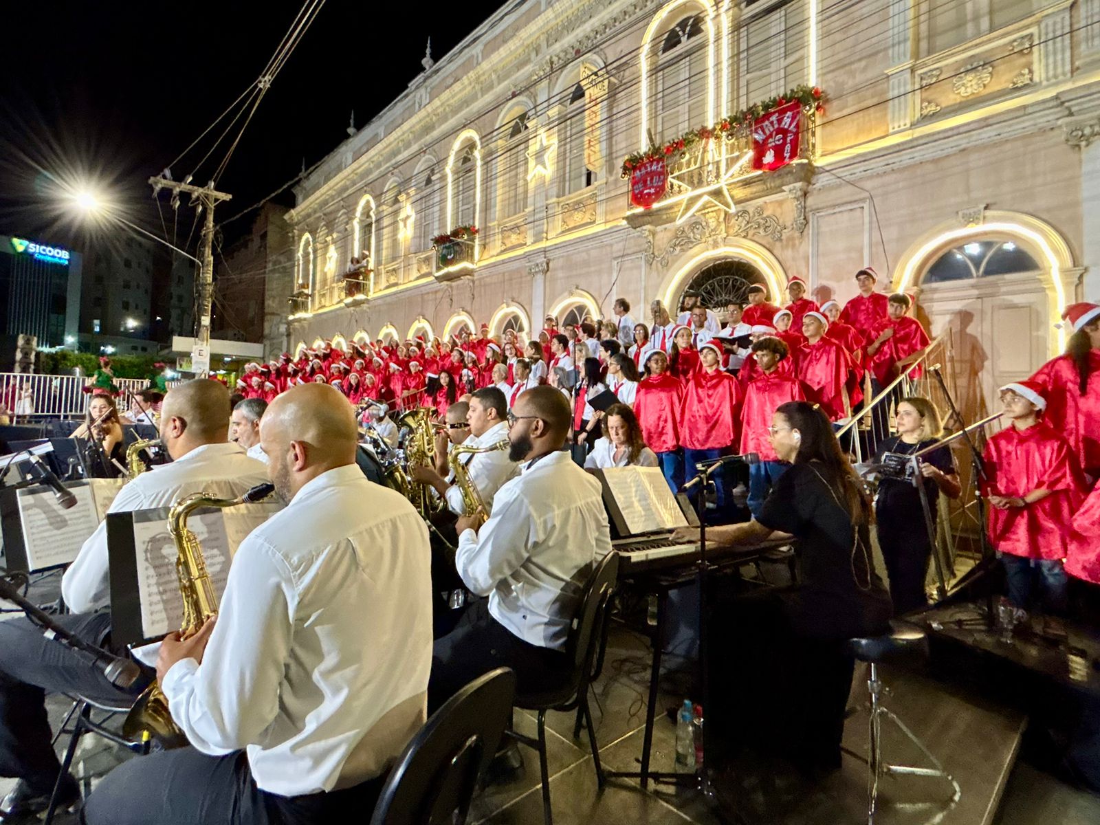 A programação artística iniciou com apresentações da Sociedade Musical União dos Artistas, do Coral Cantare e de um grande coral formado por alunos da Escola Municipal de Música Leonel Vargas, sob regência dos maestros Gidson Cerqueira e Renata Roriz. Mais de 300 crianças, de três escolas de arte, música, dança e teatro, participaram do espetáculo, interpretando clássicos natalinos e emocionando o público presente.