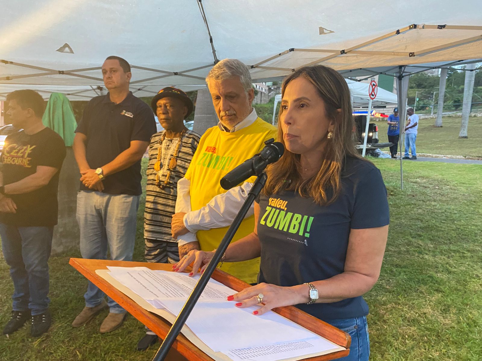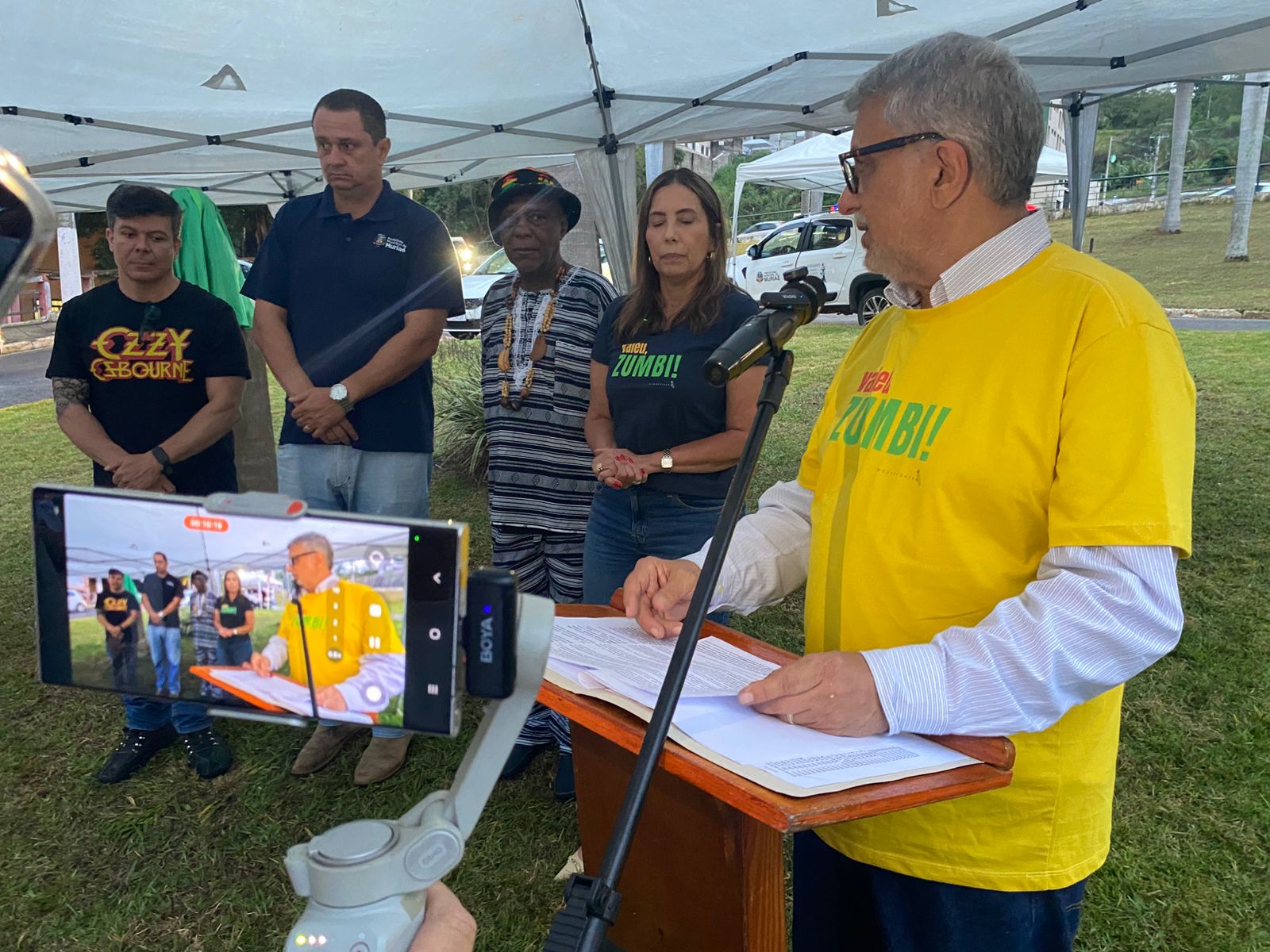 Autoridades municipais, lideranças sociais e moradores se reuniram para homenagear o líder do maior quilombo da história do país, cuja trajetória segue inspirando gerações. O prefeito Dr. Marcos Guarino de Oliveira conduziu o ato, ao lado da primeira-dama e secretária de Direitos Humanos e Cidadania, Tatiana Rangel Viana, do vice-prefeito Manoel Carvalho, do vereador Delegado Rangel Martino e de Antônio Carlos (Joca), presidente do COMPIR — Conselho Municipal de Promoção da Igualdade Racial. A vereadora Cássia Ribeiro, a Mestra Chaveirinho, também marcou presença, reforçando o caráter plural da celebração.
