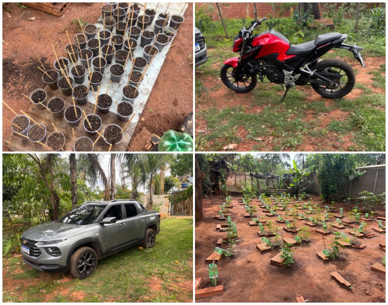 No local, os policiais visualizaram o carro pelo muro e flagraram dois homens trabalhando em uma plantação de maconha nos fundos da residência. Ambos estavam completamente sujos de terra, sendo vistos exatamente no momento em que realizavam o plantio. Durante a abordagem, um dos suspeitos estava com as chaves da Montana e documentos seus foram encontrados dentro do veículo. Ainda durante buscas no interior do imóvel, a equipe encontrou também uma motocicleta Honda CB 300F Twister, furtada em 24 de outubro deste ano, igualmente adulterada.