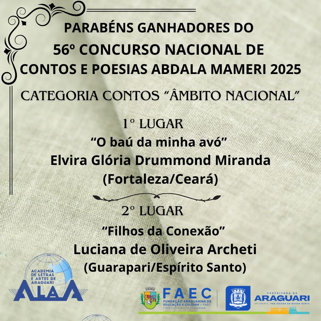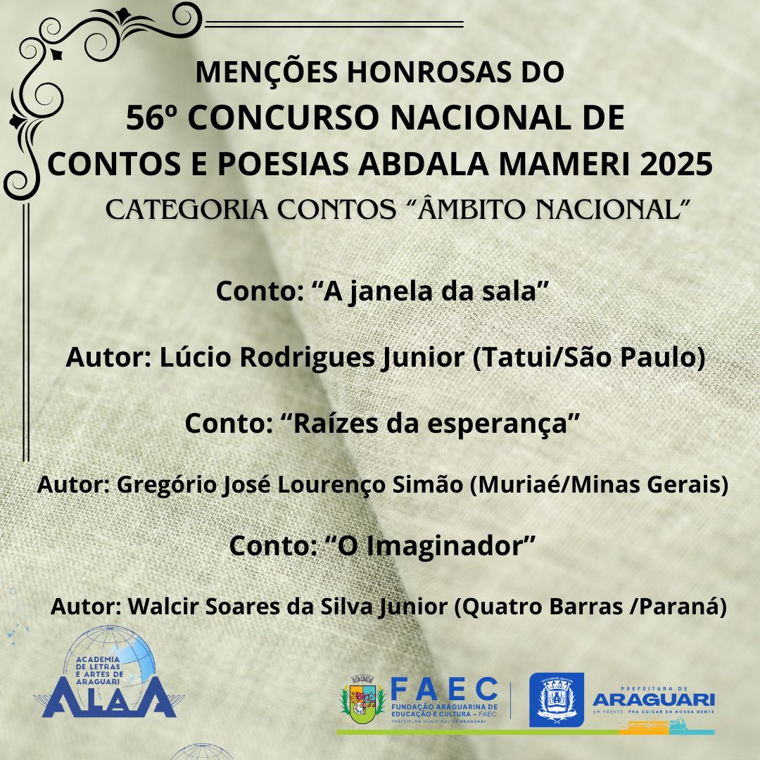 A ALAA também destacou a parceria cultural com a Prefeitura de Araguari, por meio da FAEC, que apoia o concurso desde 2022. O vice-presidente da Fundação, Wederson Prado, representou a instituição na cerimônia.