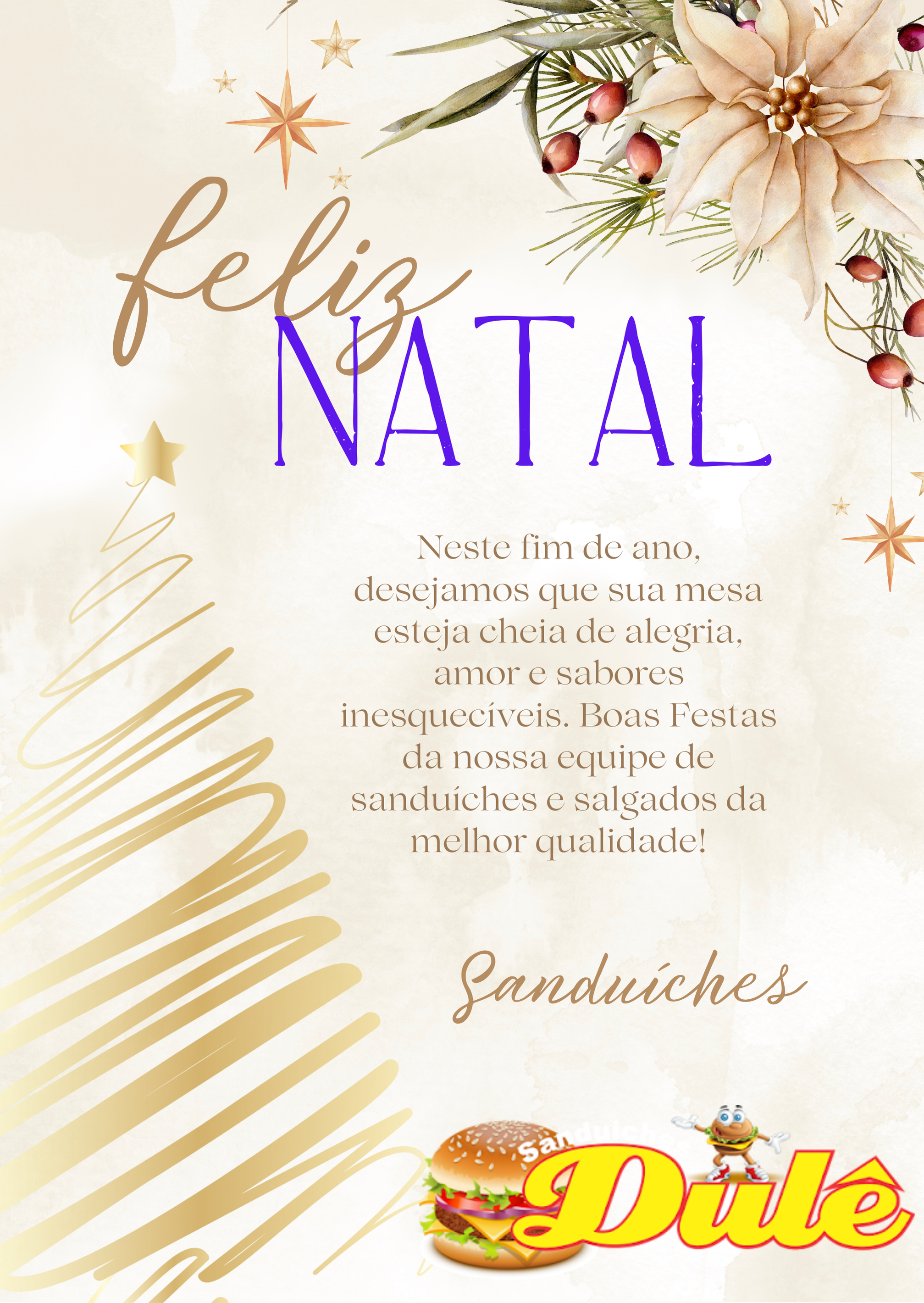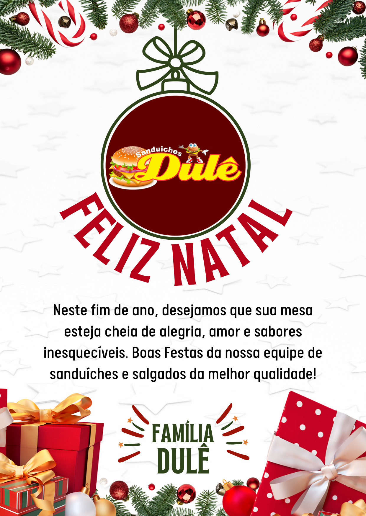 Com a chegada das festas de fim de ano, o Sanduíches Dulê aproveita o momento para agradecer a todos os clientes de Muriaé e região pela confiança e parceria ao longo do ano, desejando votos de boas festas, felicidade e muito sabor à mesa.