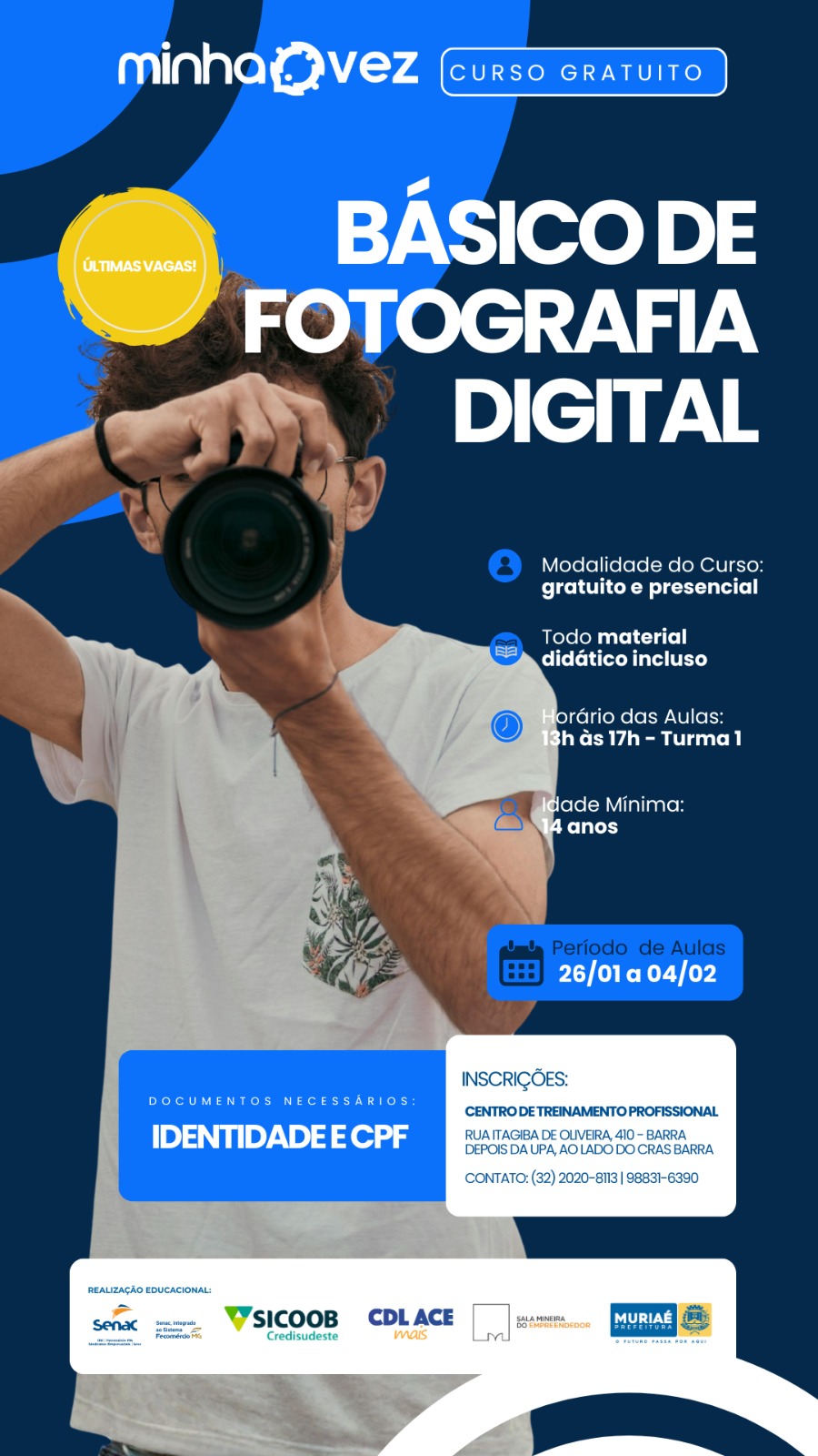 A Prefeitura de Muriaé, por meio da Secretaria Municipal de Desenvolvimento Econômico e Inovação Social, em parceria com o Senac Minas, Sindicomércio Leopoldina e o Sistema Fecomércio MG, está com inscrições abertas para o Curso Gratuito de Fotografia Digital.