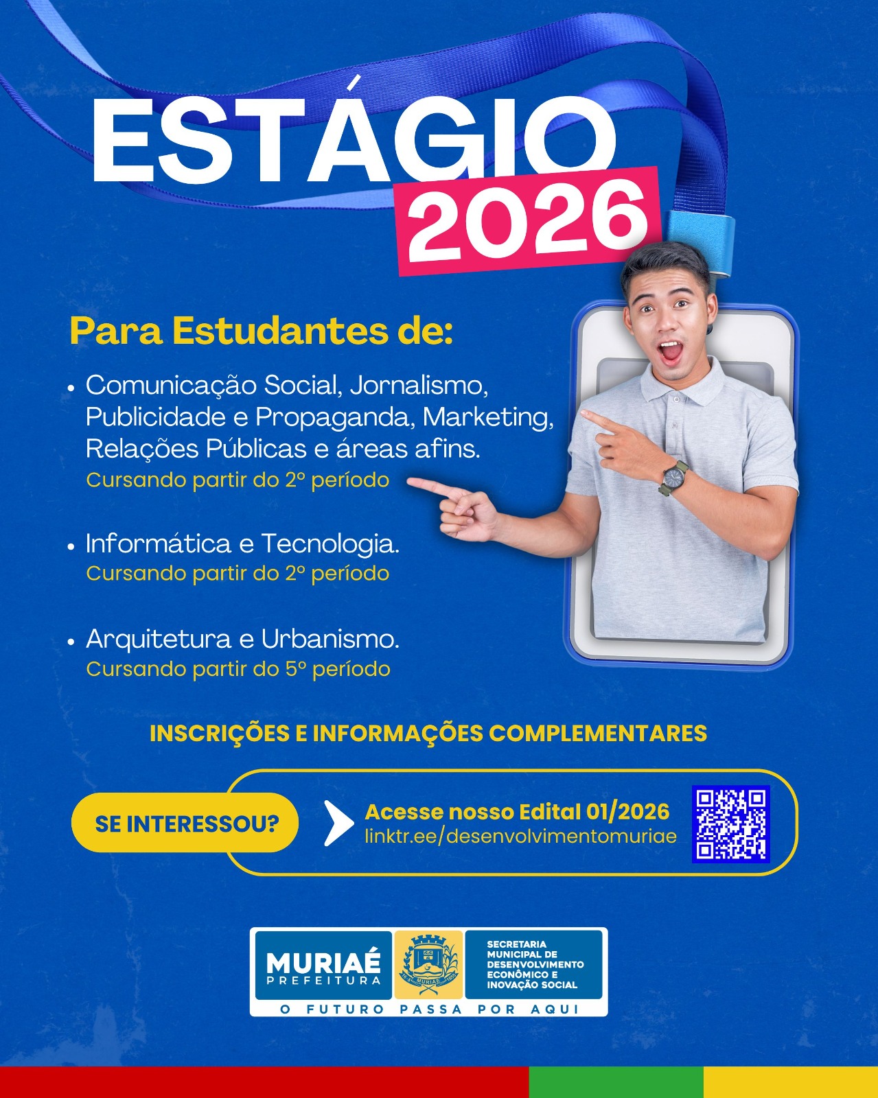 A Prefeitura de Muriaé, por meio da Secretaria Municipal de Desenvolvimento Econômico e Inovação Social, está com inscrições abertas para o Processo Seletivo de Estágio de Graduação, voltado para atuação em projetos estratégicos desenvolvidos pela secretaria.