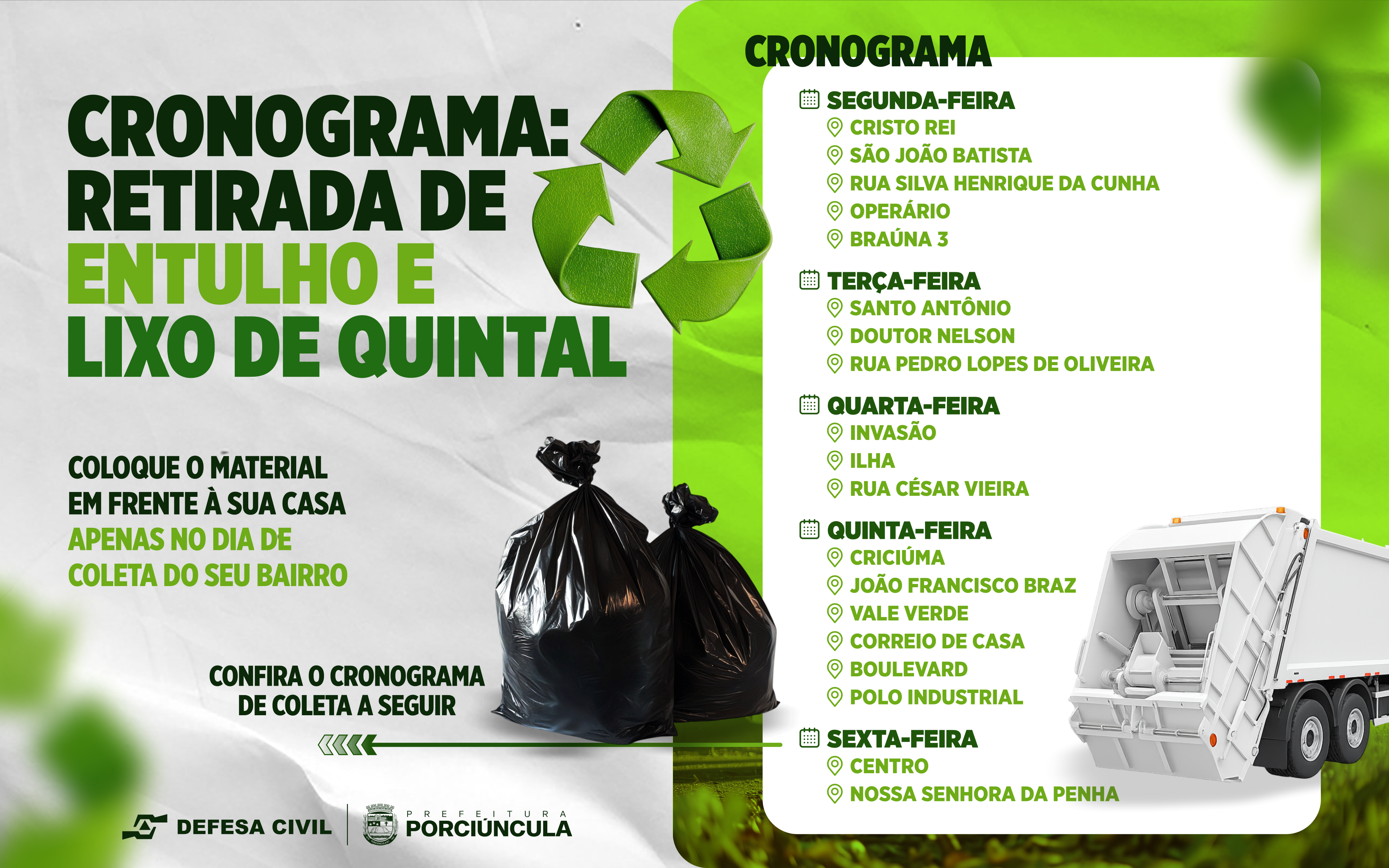 A Prefeitura de Porciúncula, por meio da Defesa Civil, informa à população sobre o cronograma semanal de retirada de entulho e lixo de quintal no município. A ação tem como objetivo manter a cidade limpa, organizada e prevenir transtornos causados pelo descarte irregular de resíduos.