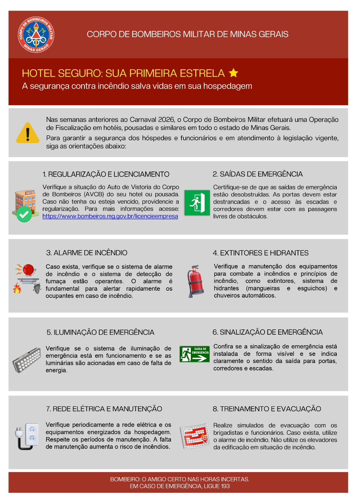 O Corpo de Bombeiros Militar de Minas Gerais (CBMMG) informa a realização da Primeira Operação Alerta Vermelho de 2026, com foco na fiscalização de hotéis, pousadas e estabelecimentos similares em todo o estado de Minas Gerais. A ação ocorre em razão da proximidade do período de Carnaval, quando há um aumento significativo da ocupação desses locais.