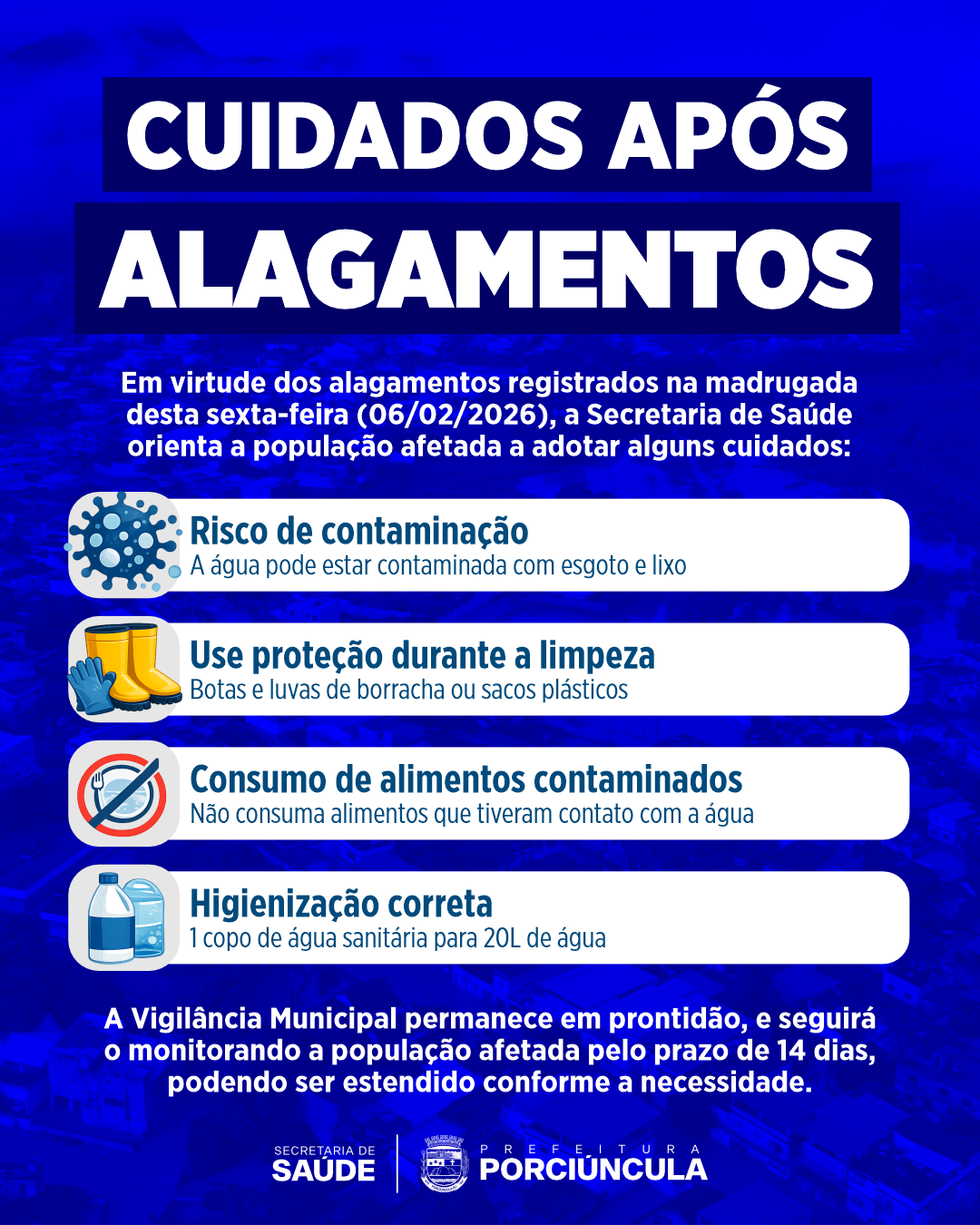Após os alagamentos registrados na madrugada desta sexta-feira, 6 de fevereiro de 2026, a Prefeitura de Porciúncula, por meio da Secretaria Municipal de Saúde, divulgou uma série de orientações importantes para as famílias que tiveram suas casas invadidas pela água das chuvas.