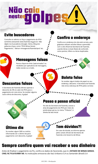 A consulta dos valores pode ser feita pelo Renavam do veículo, no site da Secretaria de Estado de Fazenda de Minas Gerais (SEF/MG), pelo telefone 155 do LIGMINAS e no aplicativo MG App.