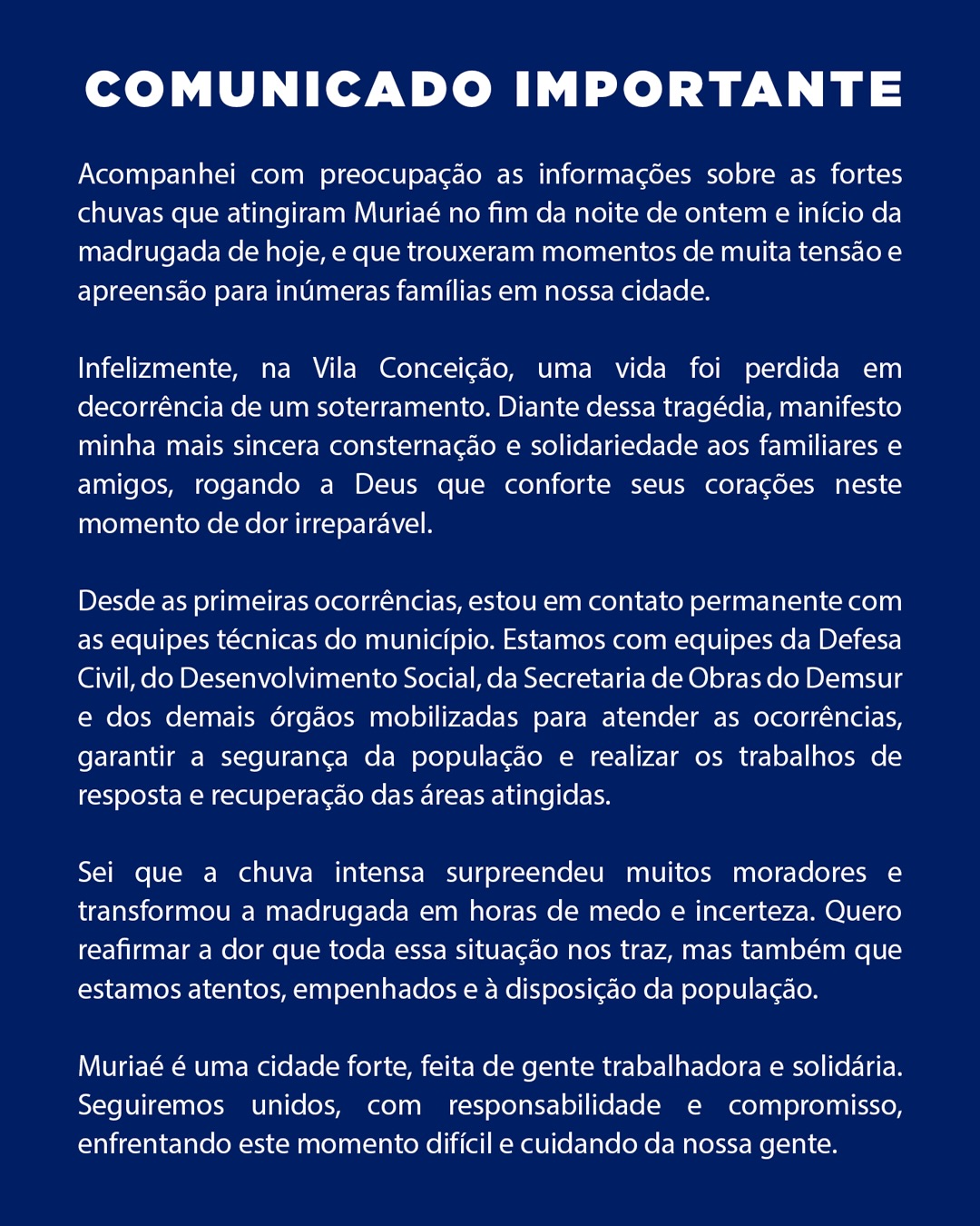Segundo ele, a chuva intensa surpreendeu muitos moradores e transformou a madrugada em horas de medo e incerteza. O chefe do Executivo reforçou que o município segue atento, empenhado e à disposição da população para enfrentar o momento difícil.