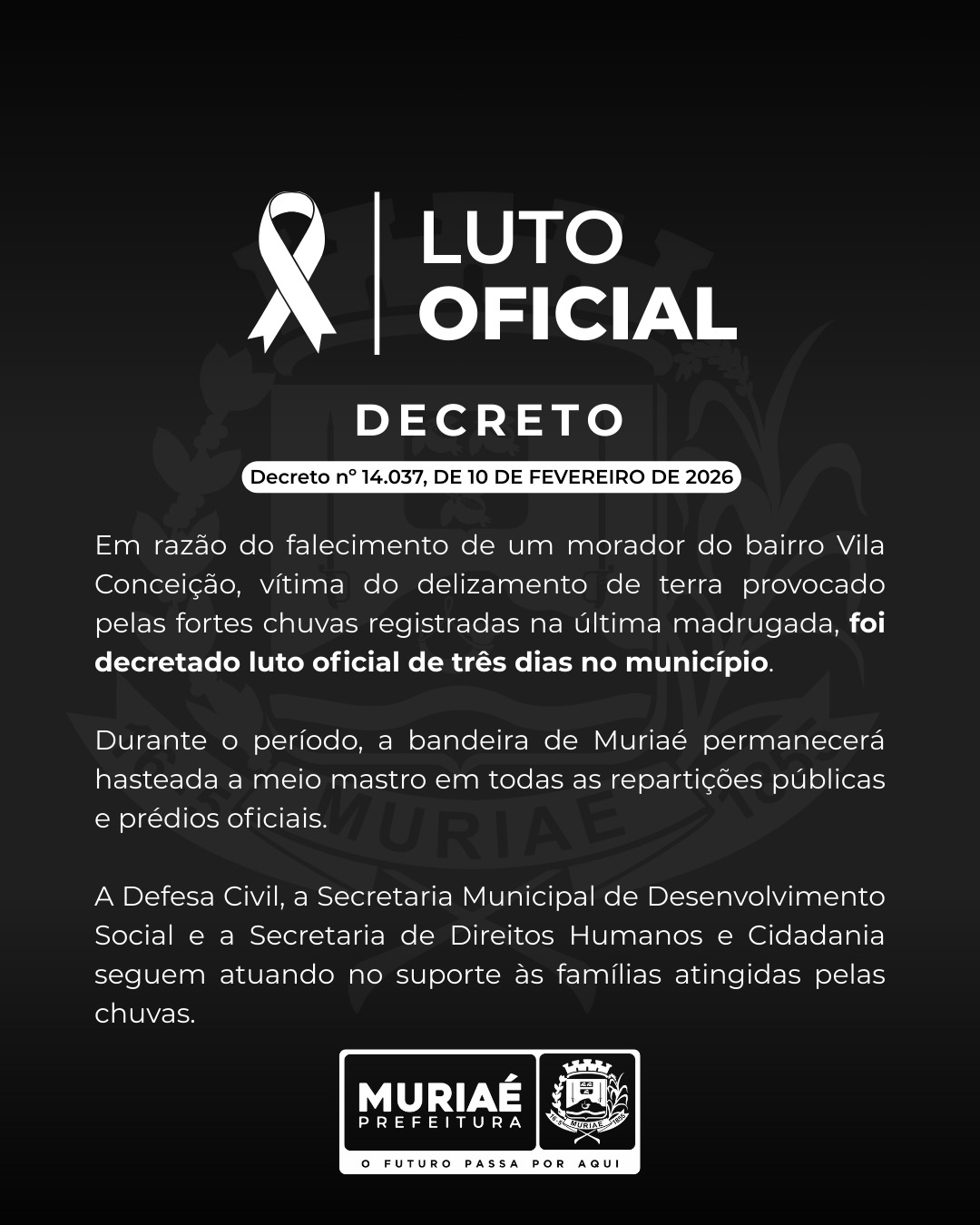 O decreto número 14.037, de 10 de fevereiro de 2026, será publicado na edição de quarta-feira (11) do Diário Oficial dos Municípios Mineiros. Durante o período de luto, a bandeira de Muriaé permanecerá hasteada a meio mastro em todas as repartições públicas e prédios oficiais.