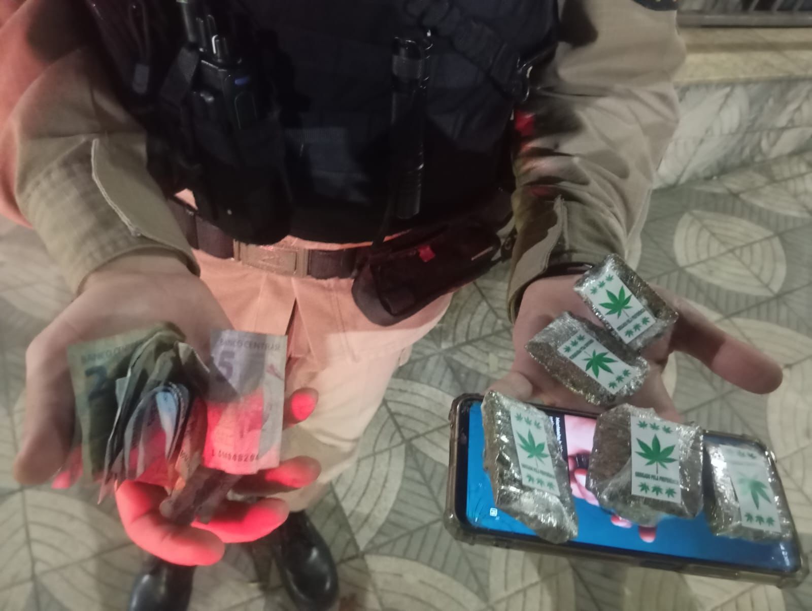 Na abordagem, os militares encontraram cinco tabletes de maconha já embalados e prontos para venda, com etiquetas personalizadas. Segundo a PM, o próprio suspeito confessou que estava traficando e ainda contou quanto cobrava por cada unidade.