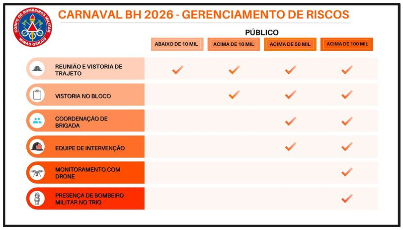 O crescimento do Carnaval de rua em Minas Gerais nos últimos anos levou o Corpo de Bombeiros Militar a evoluir sua forma de atuação, transformando experiências anteriores e dados operacionais em inteligência para 2026. Diante da complexidade de gerenciamento do risco em hiperpúblicos, foram estabelecidos eixos de atuação, que têm como parâmetro o lançamento de equipes e tecnologias de acordo com o quantitativo de público em cada desfile.