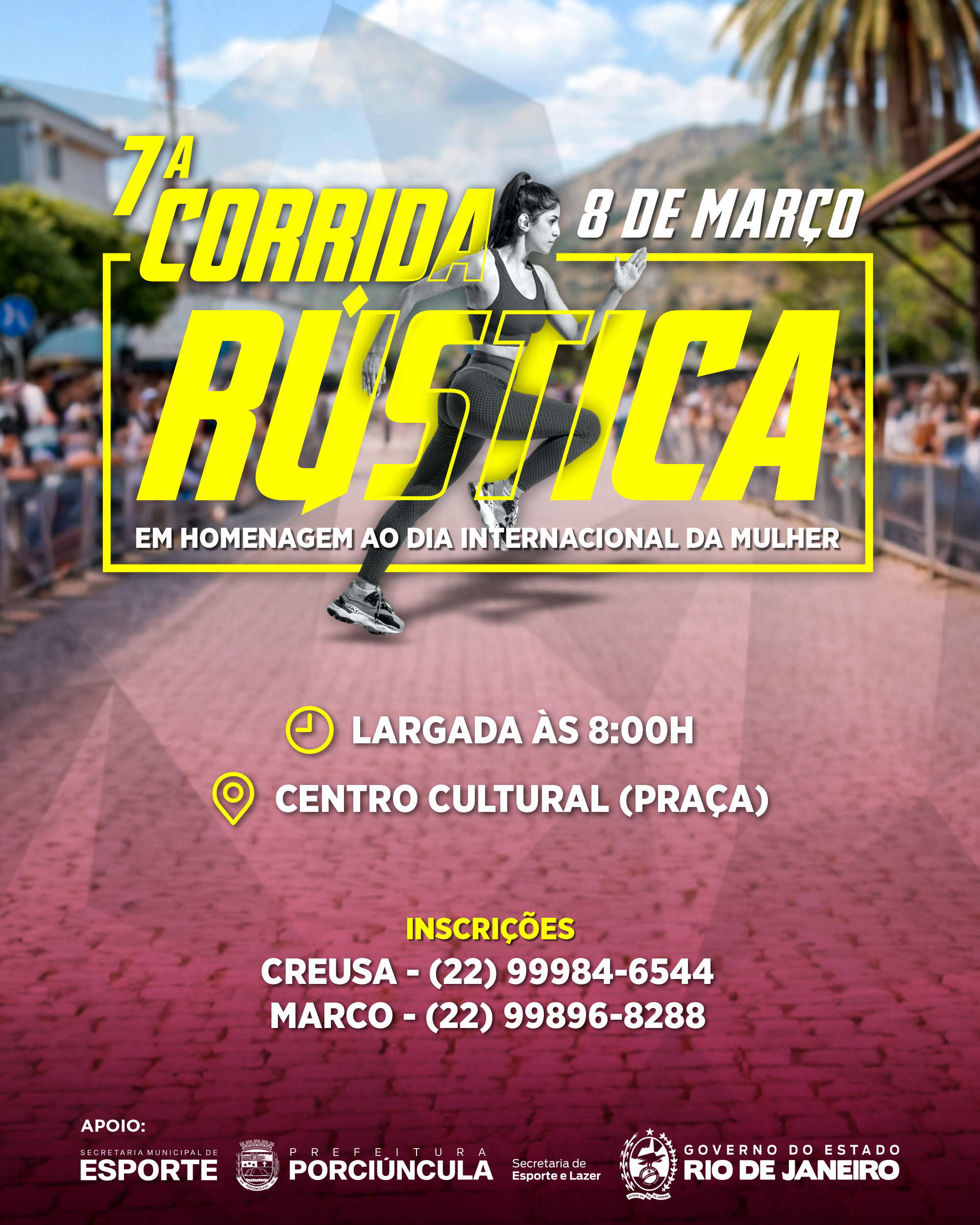 A cidade de Porciúncula já está em clima de festa e superação com a chegada da 7ª Corrida Rústica em homenagem ao Dia Internacional da Mulher. O evento acontece no dia 08 de março, com concentração e largada às 8 horas da manhã, no Centro Cultural de Porciúncula. Será um momento especial para celebrar a força, a garra e a determinação das mulheres, reunindo atletas, famílias e toda a comunidade em uma grande mobilização pela saúde e pelo bem-estar.