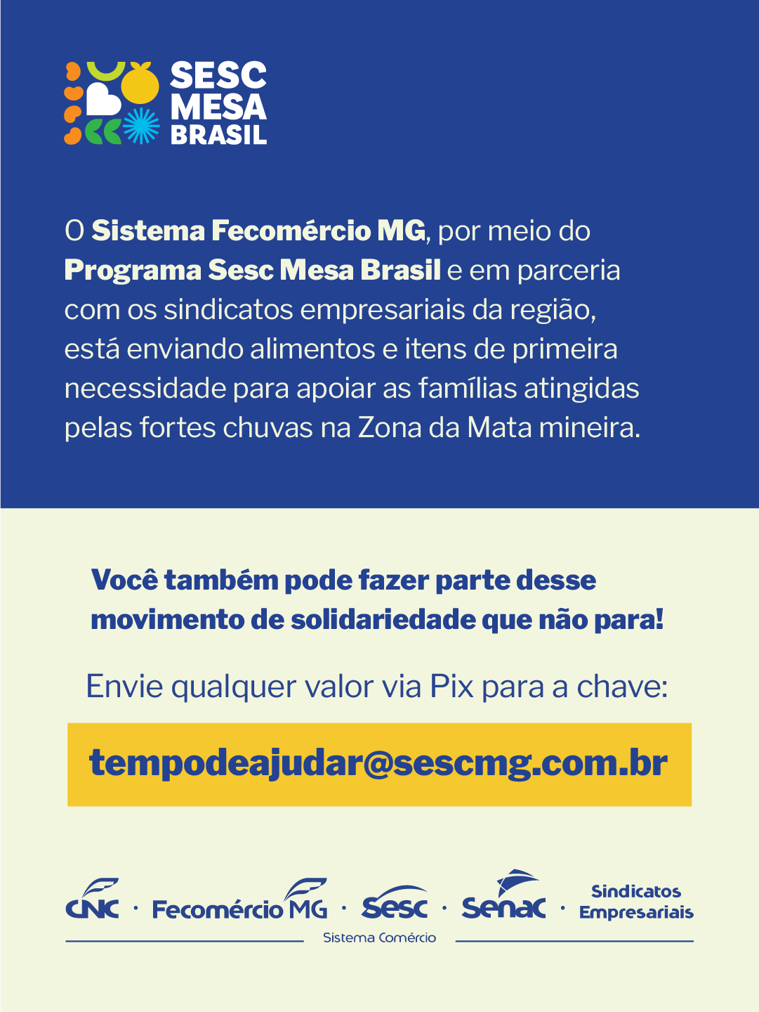 Você pode colaborar com essa corrente fazendo uma doação de qualquer quantia via pix para a chave: tempodeajudar@sescmg.com.br e convidando outras pessoas a ajudar. Toda solidariedade faz a diferença.