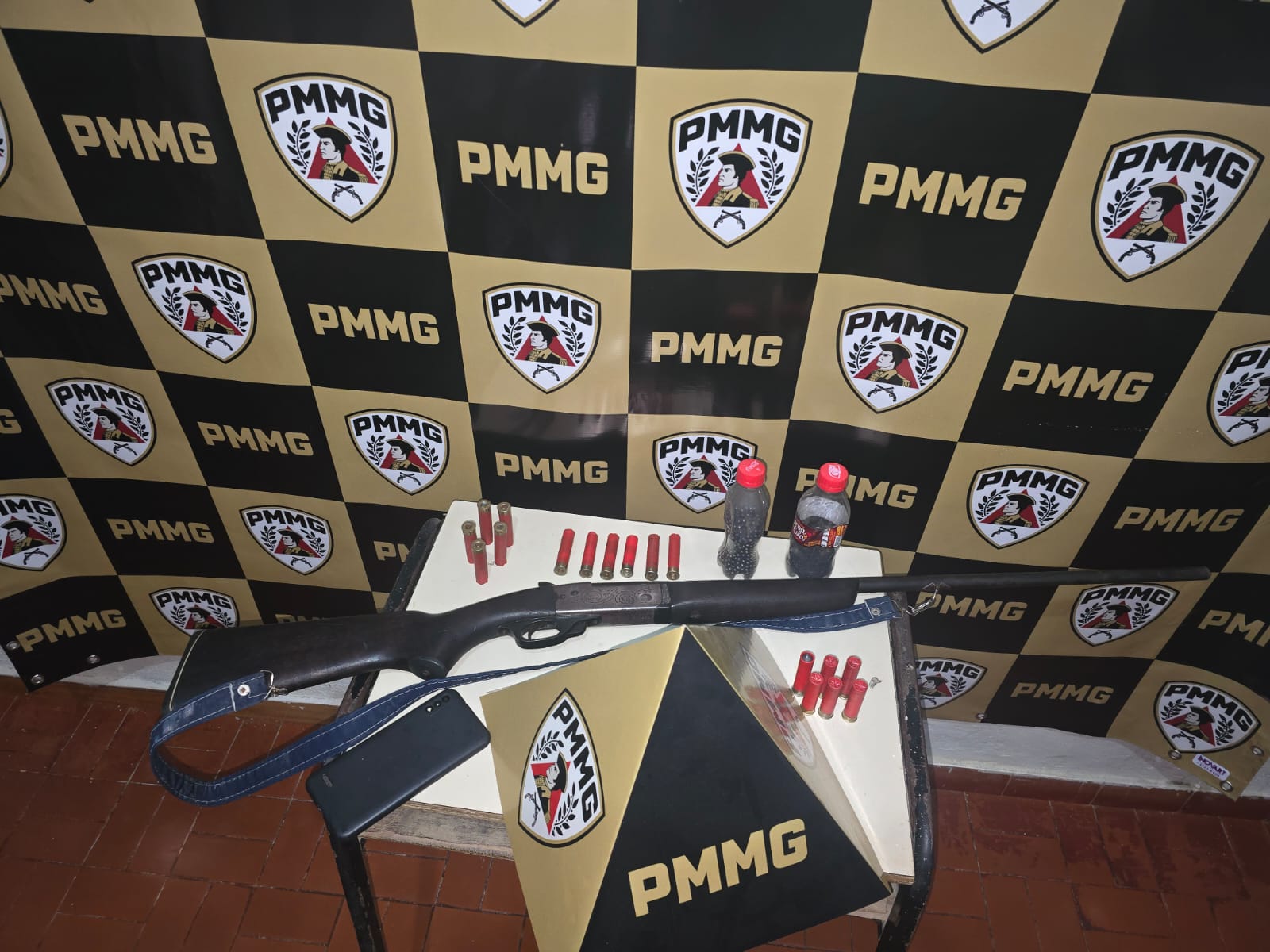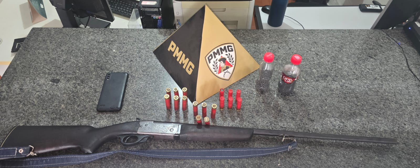 Dentro da casa, os policiais encontraram uma espingarda calibre trinta e dois escondida dentro de um sofá. Também foram localizadas munições intactas, munições já usadas e materiais para recarregar cartuchos. O próprio autor confirmou que a arma era dele e que estava irregular.