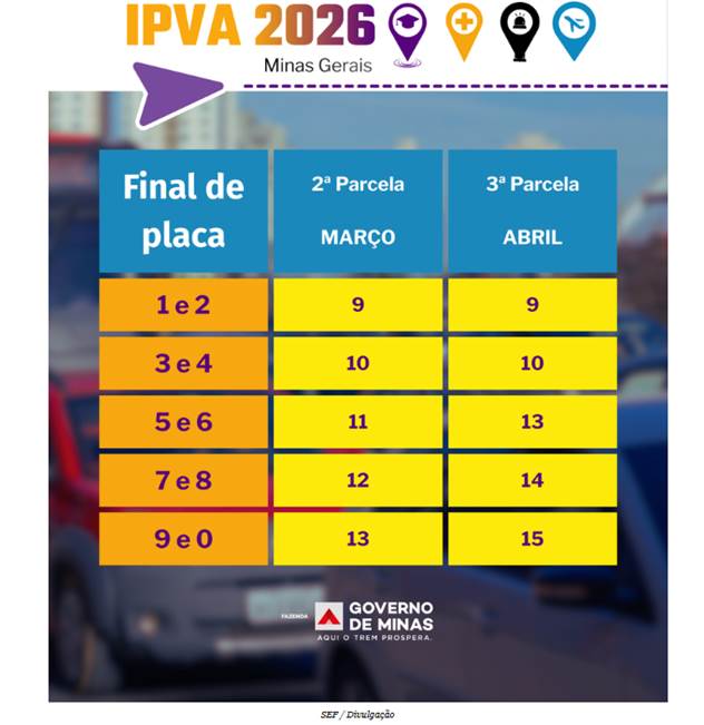 A segunda parcela do IPVA 2026 vence na próxima semana, de 9 a 13/3, conforme o final de placa. Confira: