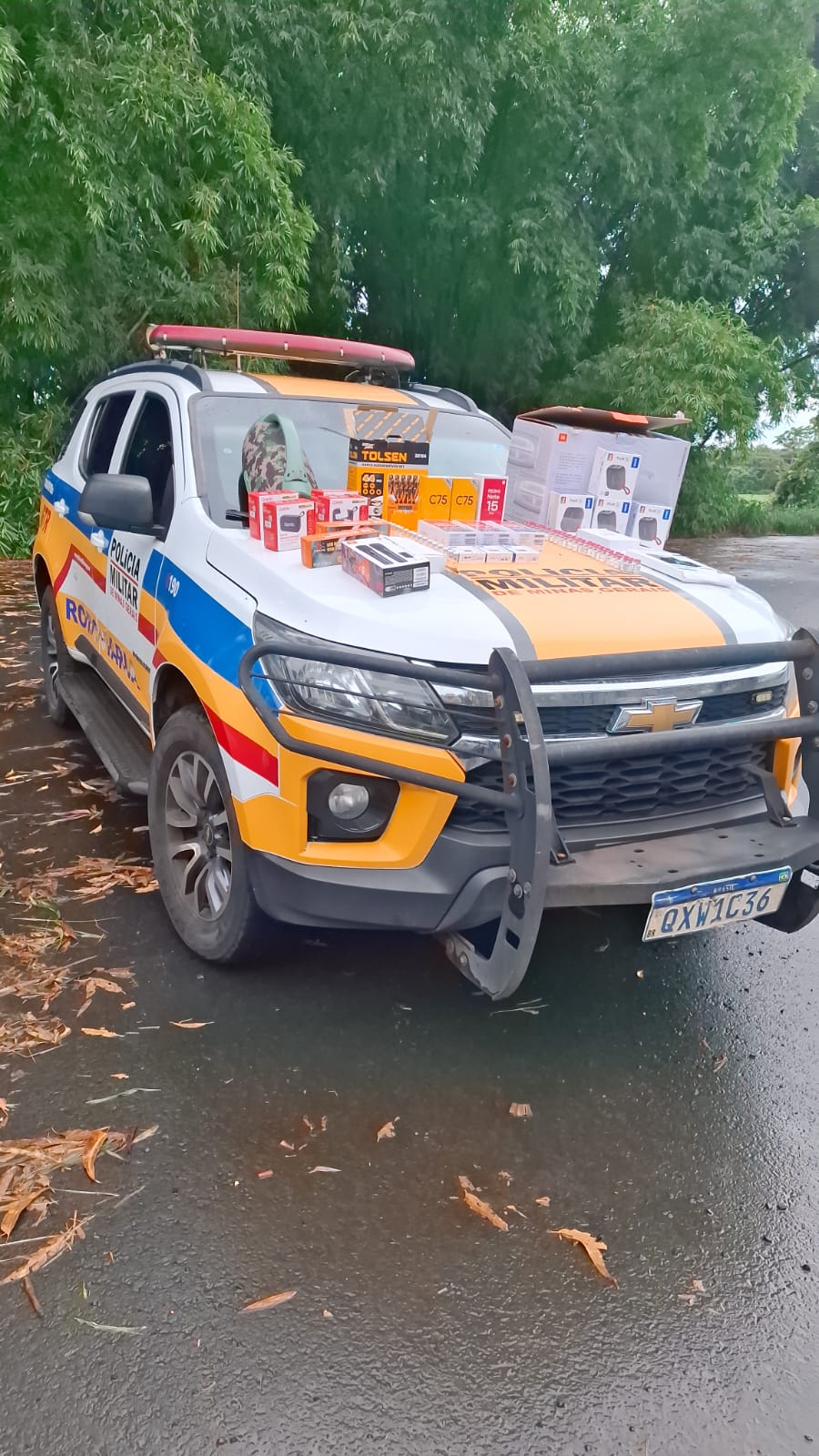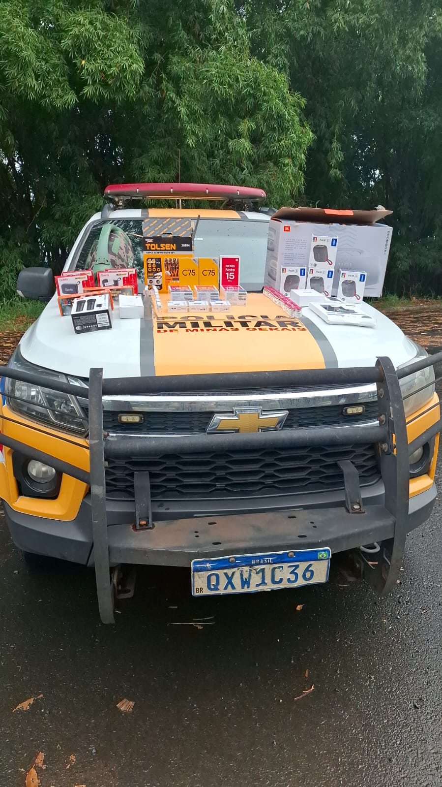 Dentro do carro também havia vários eletrônicos, como telefones celulares, caixas de som e outros equipamentos.