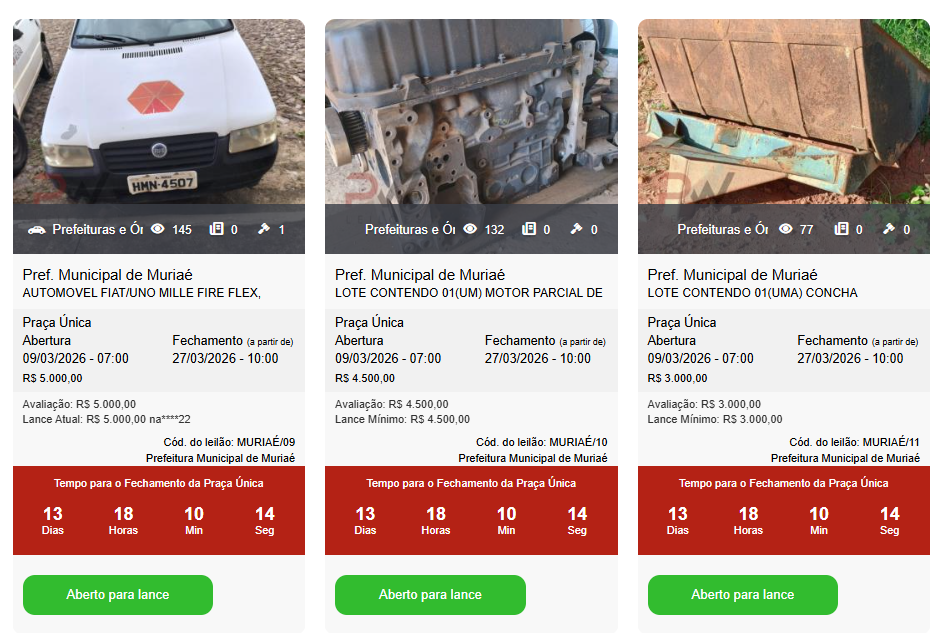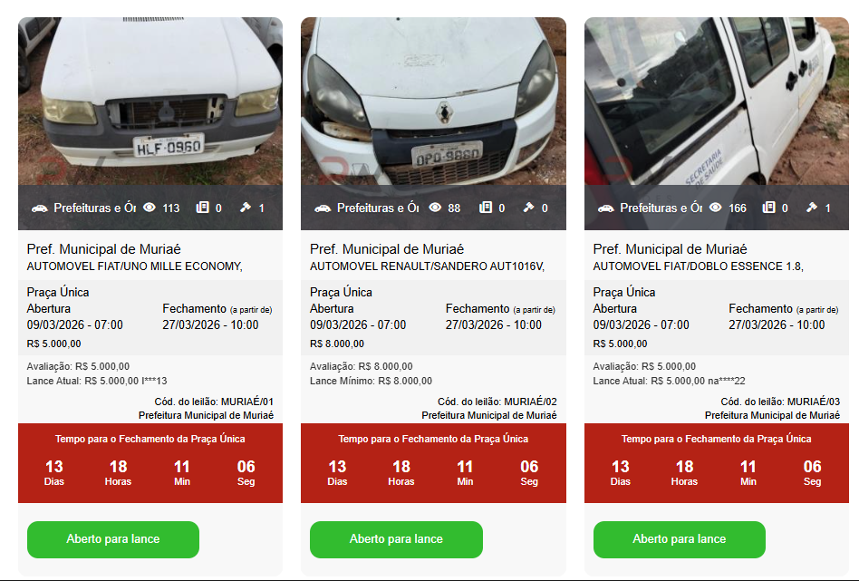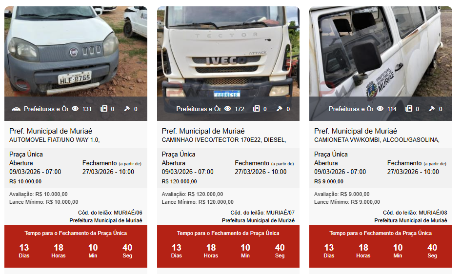 Os veículos disponíveis para arremate poderão ser vistoriados previamente até o dia 26 de março de 2026. Para realizar a visitação, o interessado deverá entrar em contato com o Setor de Licitações da Prefeitura de Muriaé, através do e-mail protocololicitacao@muriae.mg.gov.br, informando os lotes que pretende visitar ou vistoriar, para que seja feita a designação de data, local e horário da visita.