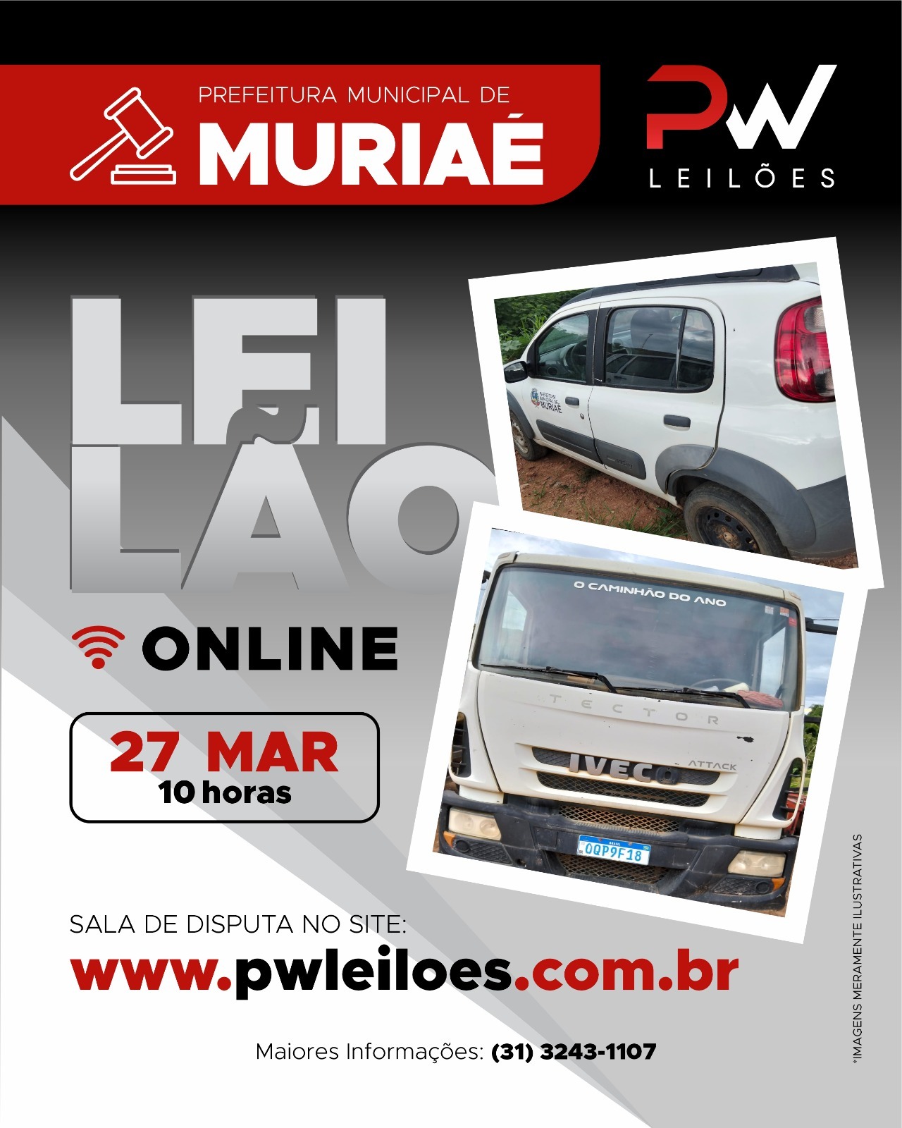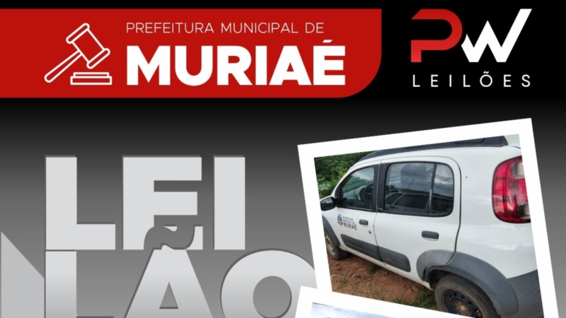A Prefeitura de Muriaé, por meio da Secretaria Municipal de Administração e do Setor de Licitações, em parceria com a PW Leilões, informa que será realizado Leilão Público de Veículos pertencentes ao patrimônio municipal.