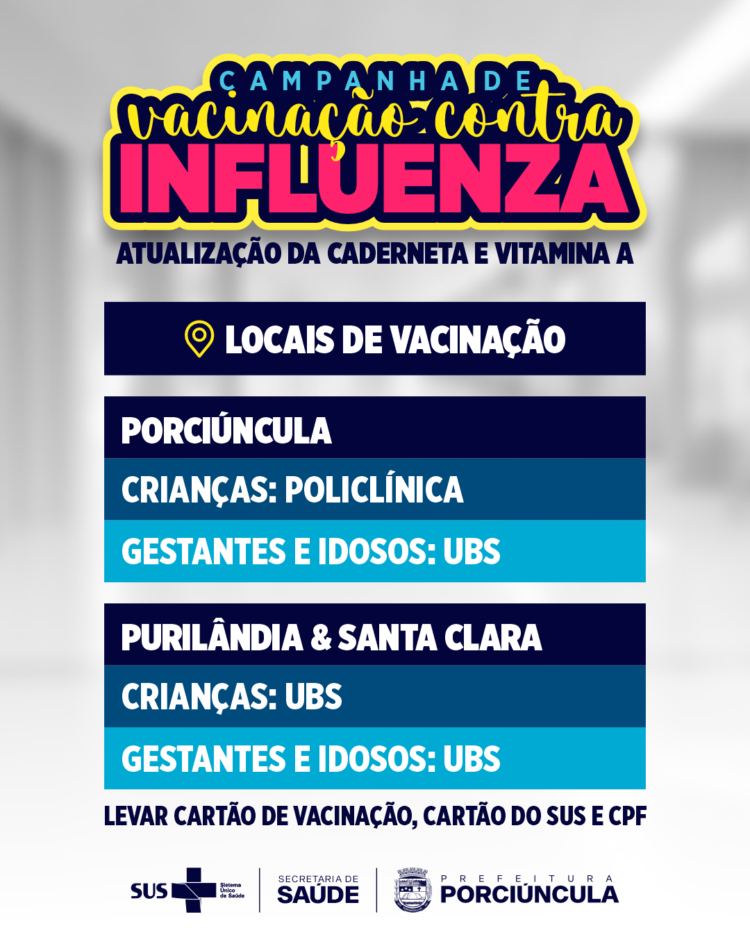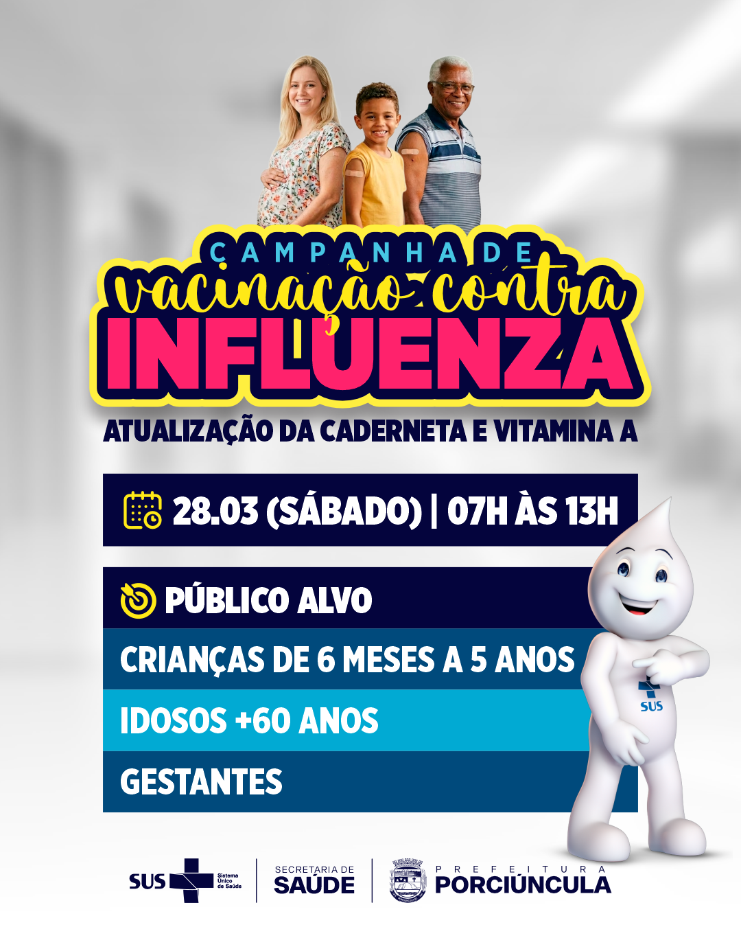 A Prefeitura de Porciúncula, por meio da Secretaria Municipal de Saúde, promoverá no próximo sábado, dia 28, a Campanha de Vacinação contra a Influenza. A mobilização acontecerá das 7h às 13h nas unidades de saúde do município, com o objetivo de ampliar a proteção da população contra o vírus da gripe e fortalecer as ações de prevenção neste período de maior circulação de doenças respiratórias.