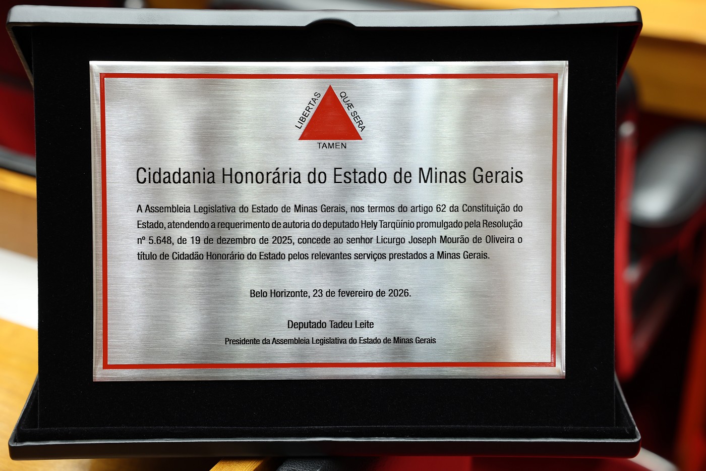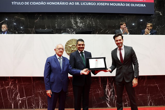 Minas Gerais ganhou mais um cidadão honorário, o conselheiro em exercício do Tribunal de Contas do Estado (TCE-MG) Licurgo Joseph Mourão de Oliveira. Ele foi agraciado na noite desta quinta-feira (19/3/26) em Reunião Especial no Plenário da Assembleia Legislativa de Minas Gerais (ALMG).