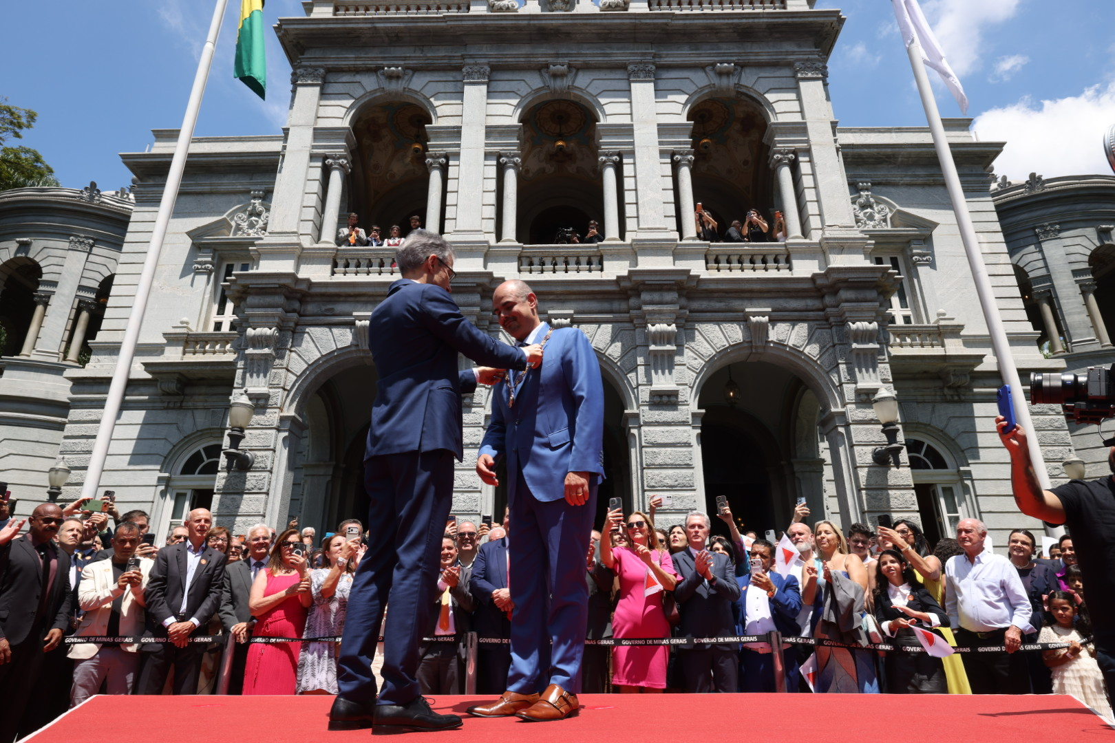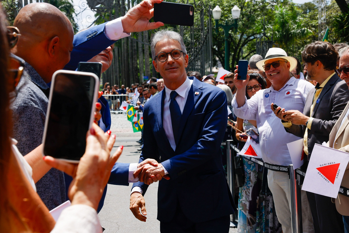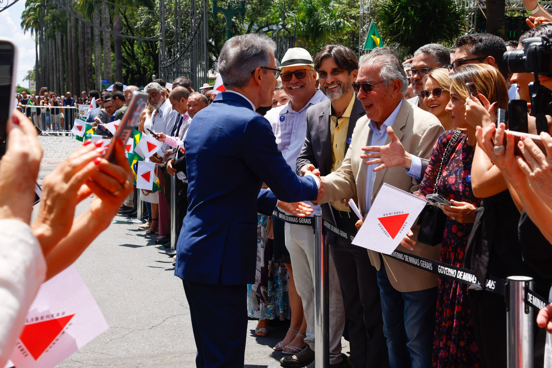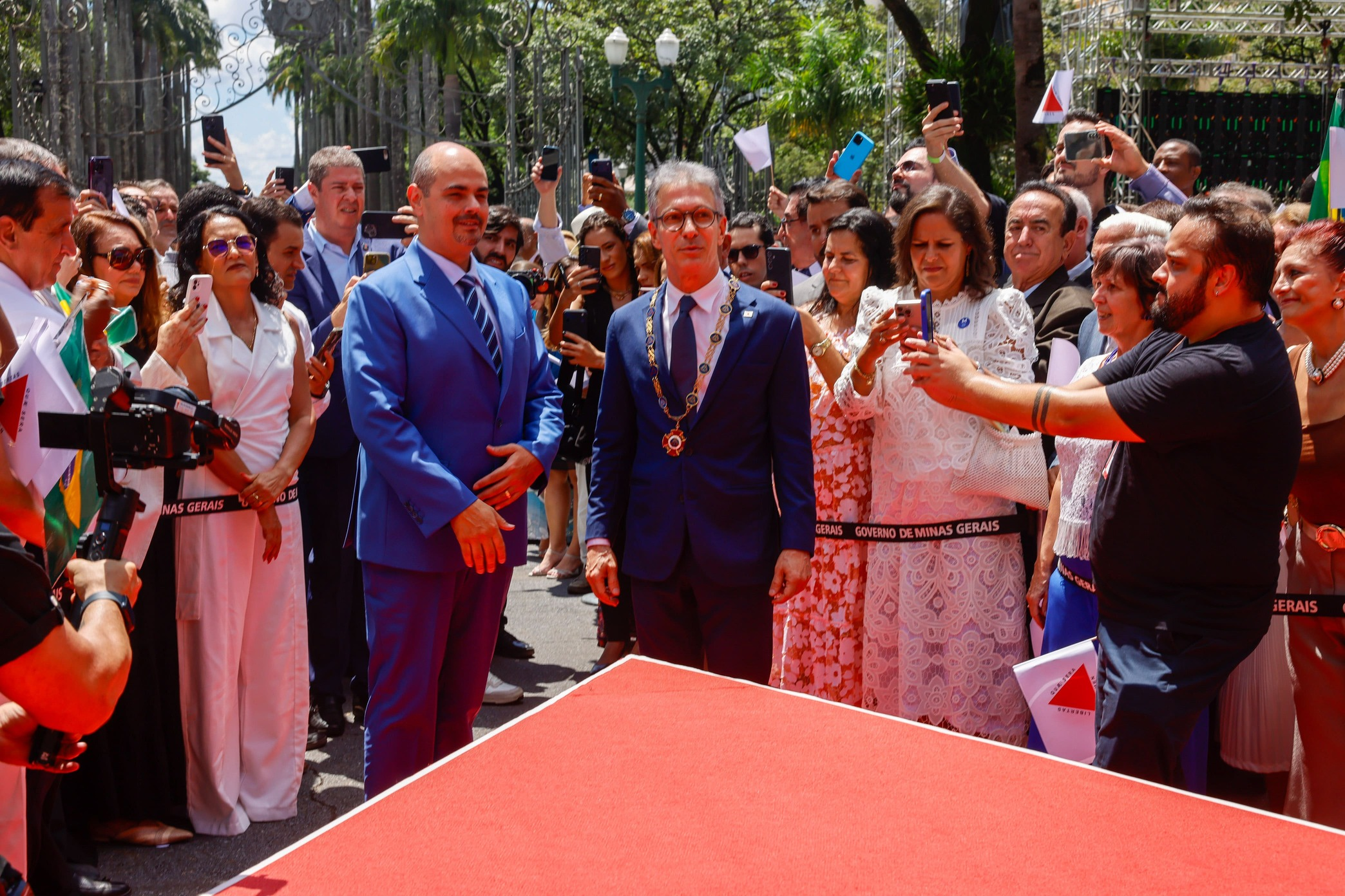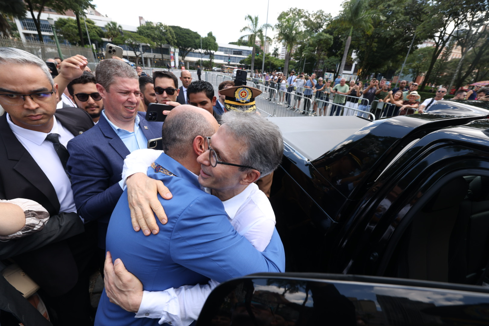 Na sequência, o novo governador acompanhou Romeu Zema até o portão principal do Palácio da Liberdade, momento em que o ex-governador se despediu e deixou o local.