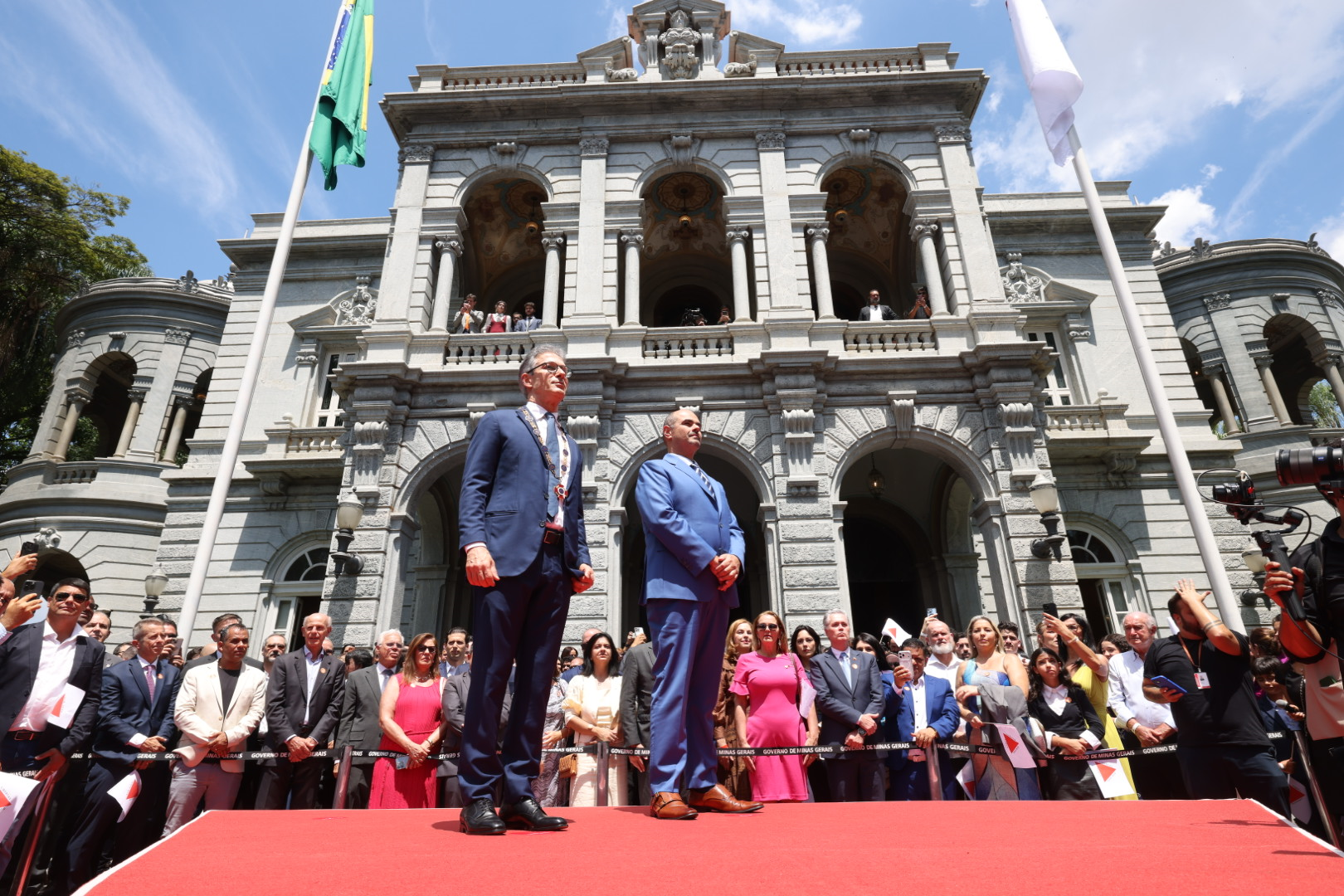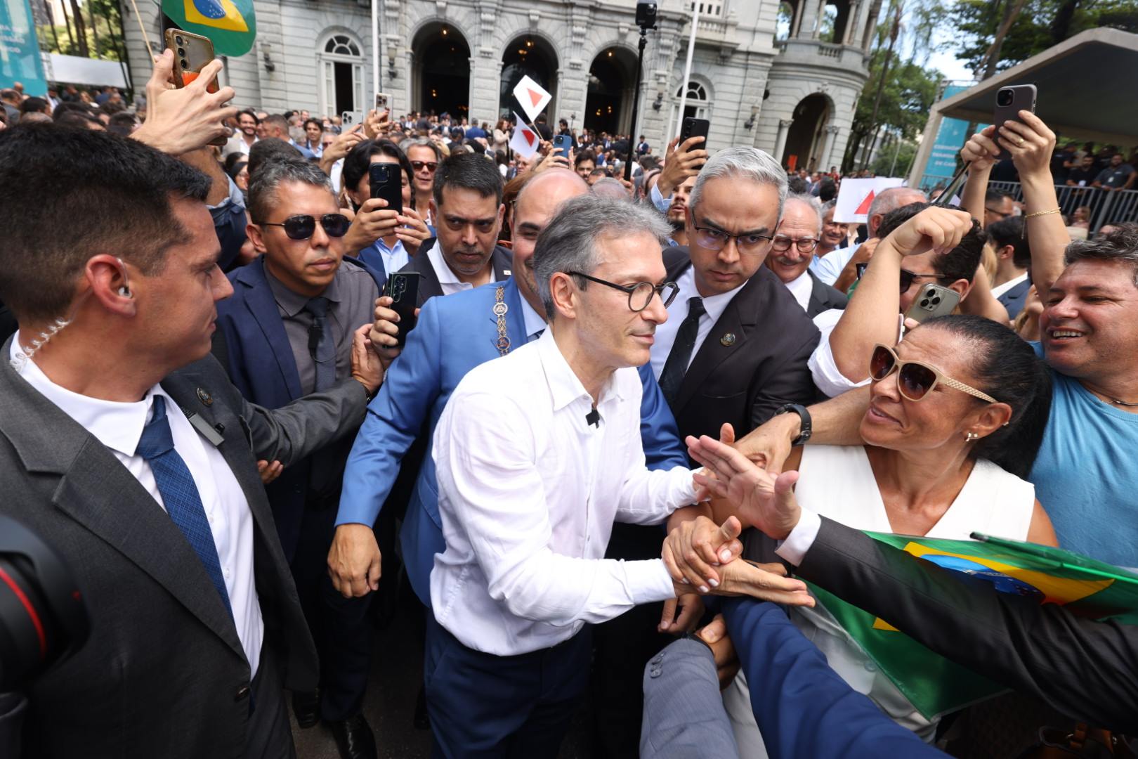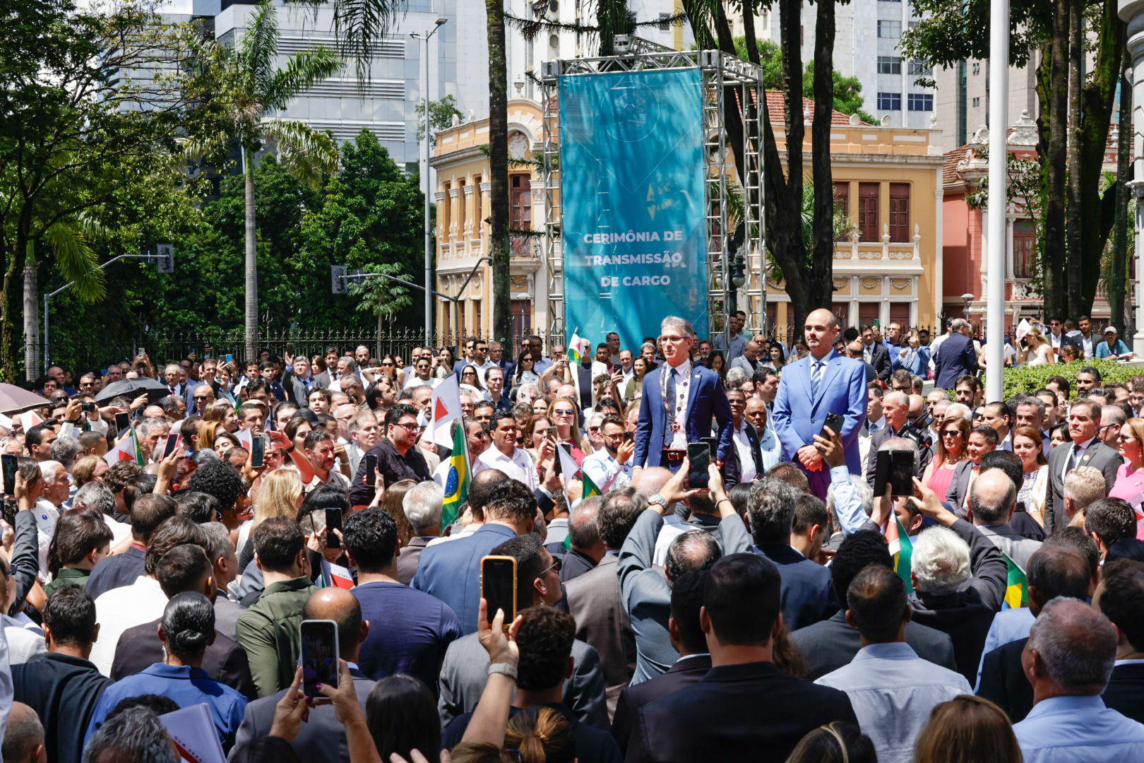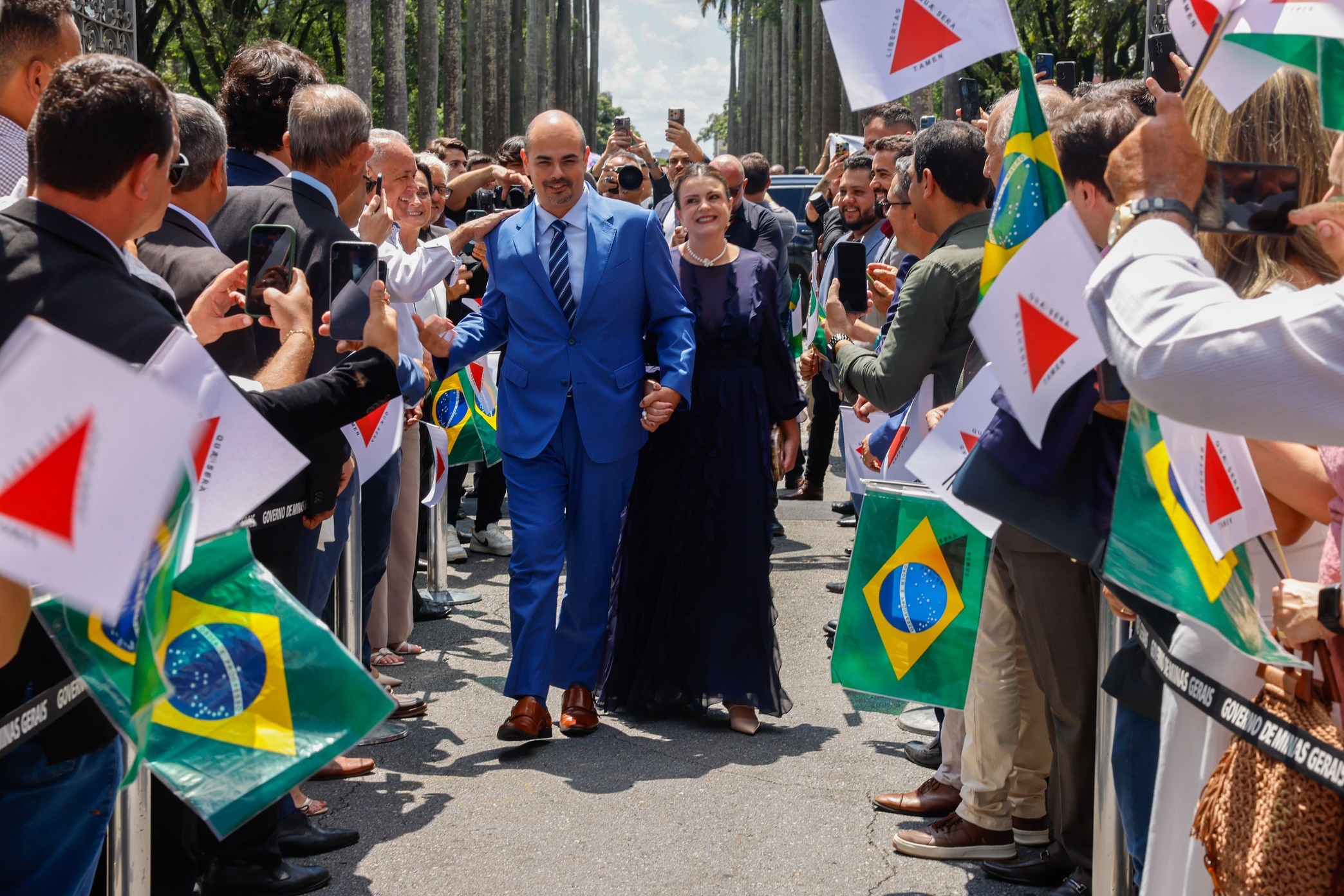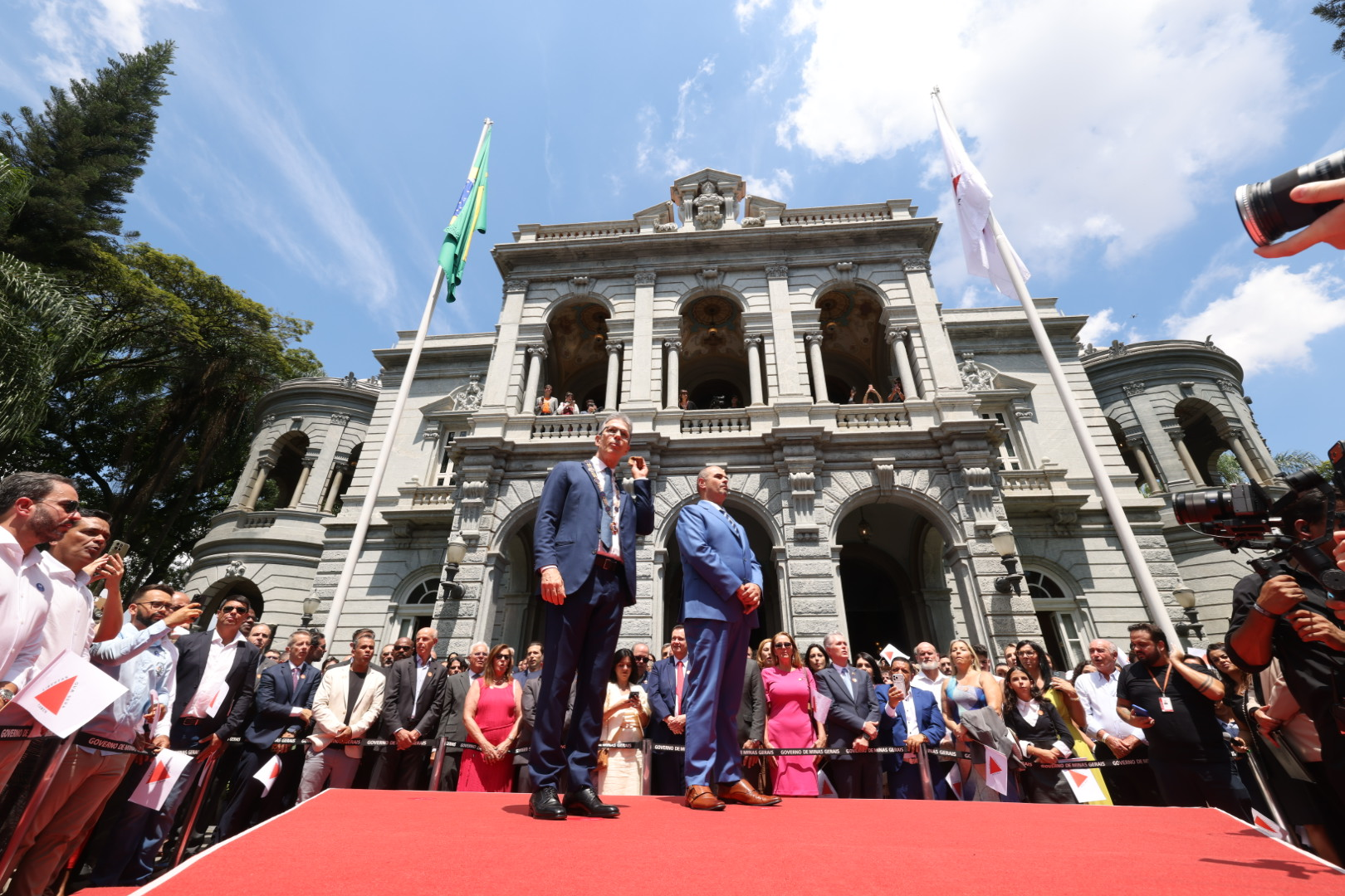 Na sequência, o novo governador acompanhou Romeu Zema até o portão principal do Palácio da Liberdade, momento em que o ex-governador se despediu e deixou o local.