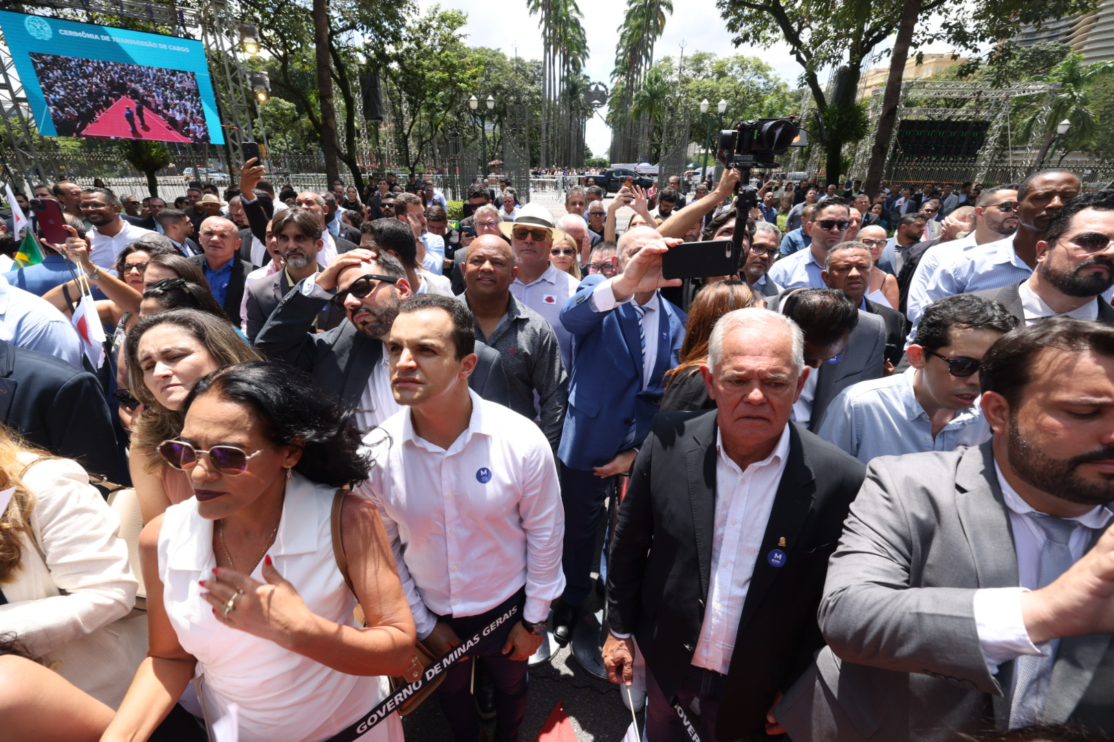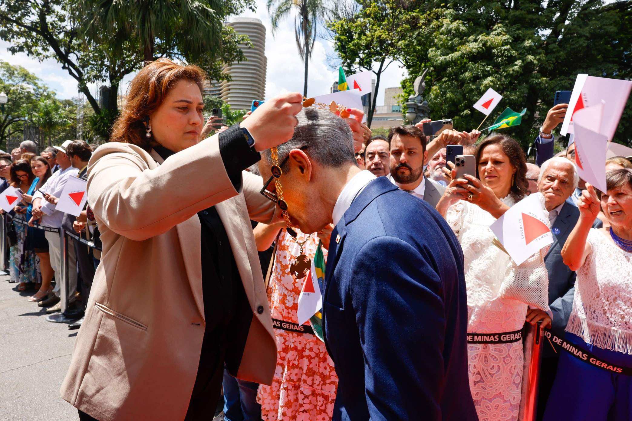 Após a execução do hino nacional brasileiro, realizado pela Banda da Polícia Militar de Minas Gerais (PMMG), o governador Romeu Zema passou o Grande Colar da Inconfidência – maior honraria concedida pelo Estado – ao governador Mateus Simões, ato que simboliza a transmissão do cargo. Em seguida, os dois discursaram aos convidados e a todos os mineiros. “Assumir o Governo de Minas Gerais é uma honra para qualquer pessoa. Para um menino que saiu da fazenda com 14 anos de idade, órfão de pai e mãe e, 30 anos depois, estar na frente deste palácio, é muito mais do que eu podia ter imaginado em qualquer momento. É uma honra enorme receber essa tarefa dada a mim, pelo ex-governador Romeu Zema, de conduzir o estado daqui em diante”, disse Mateus Simões.