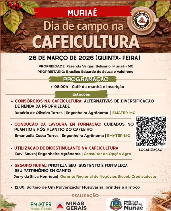Será realizado em Muriaé um importante Dia de Campo voltado à cafeicultura, reunindo produtores, técnicos e interessados no fortalecimento da atividade rural na região.
