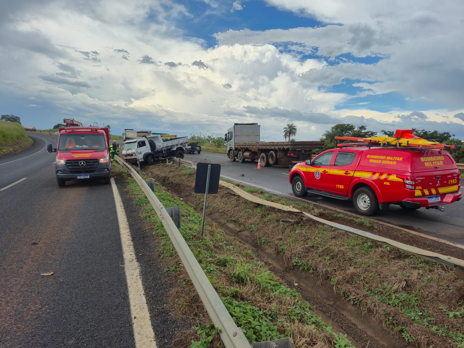 Um caminhão basculante acabou se envolvendo em um acidente depois que o pneu dianteiro simplesmente estourou enquanto o veículo seguia pela pista. Com isso, o motorista perdeu o controle e bateu com tudo contra a proteção da via, parando no canteiro central.