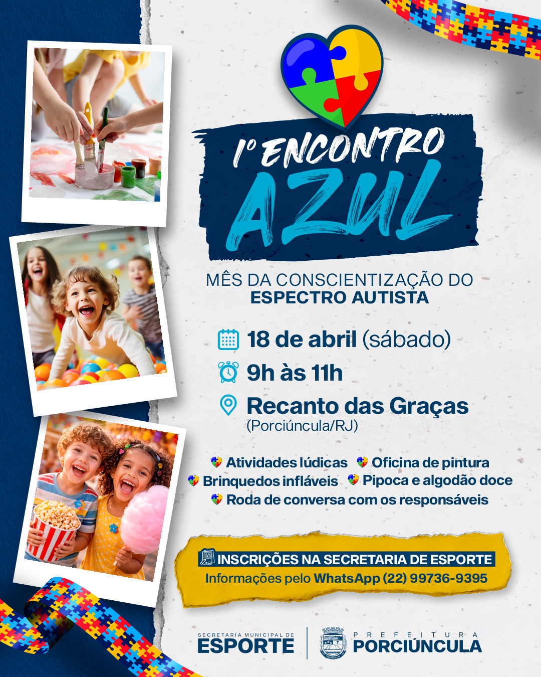 A Secretaria de Esporte de Porciúncula, em parceria com as secretarias de Saúde, Educação e Desenvolvimento Social, realiza no dia 18 de abril o 1º Encontro Azul. O evento será no Recanto das Graças, das 9h às 11h, em referência ao Mês de Conscientização sobre o Transtorno do Espectro Autista.
