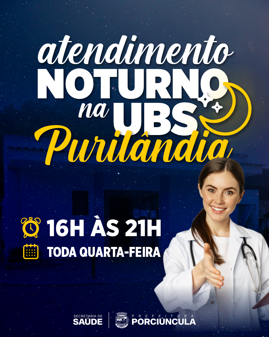 A Unidade Básica de Saúde de Purilândia ampliou o atendimento à população com novo horário, se estendendo até o turno da noite. A partir do dia 29 de abril, o atendimento noturno, com a presença do médico, acontece todas as quartas, das 16h às 21h, com livre demanda.