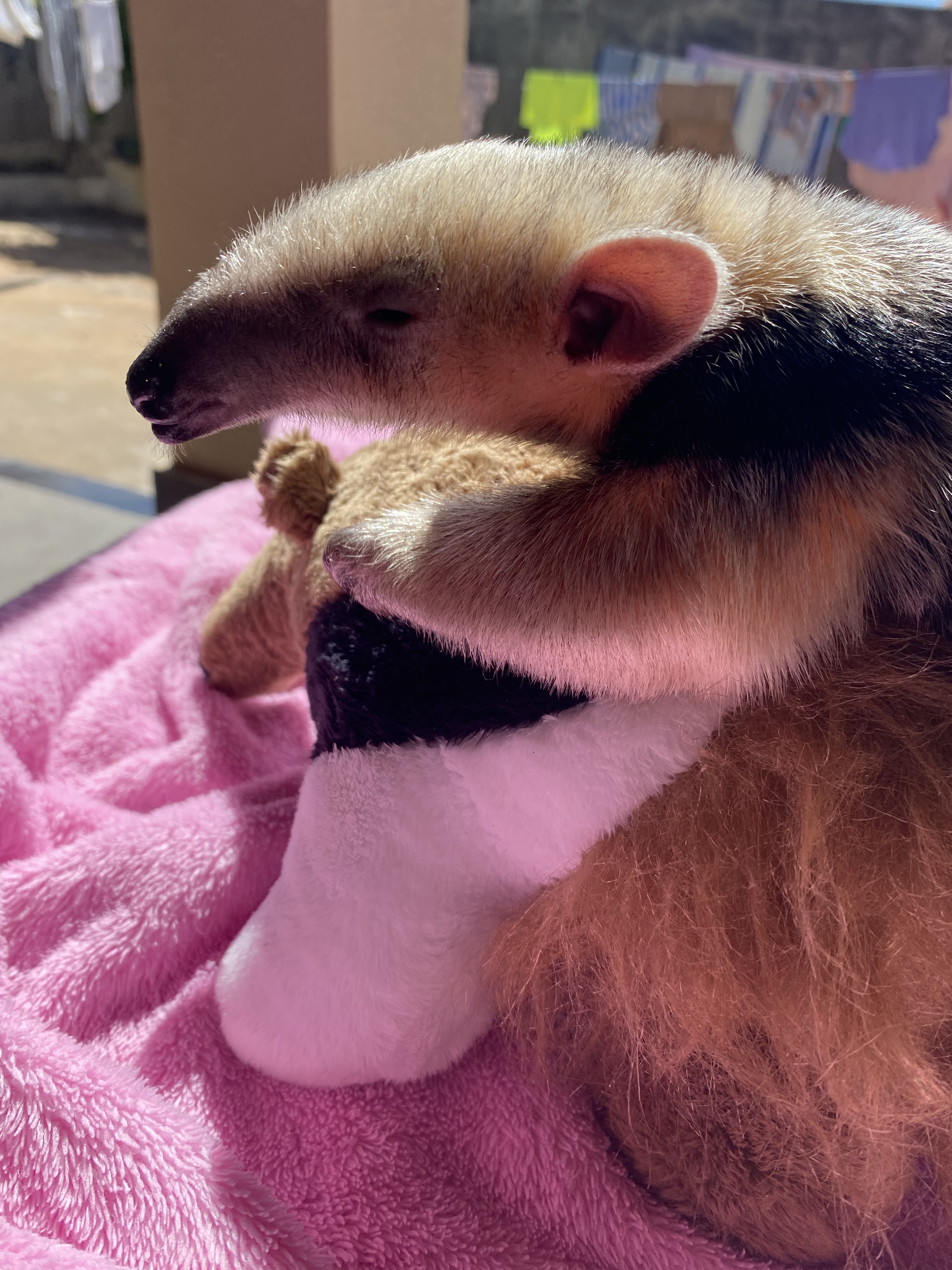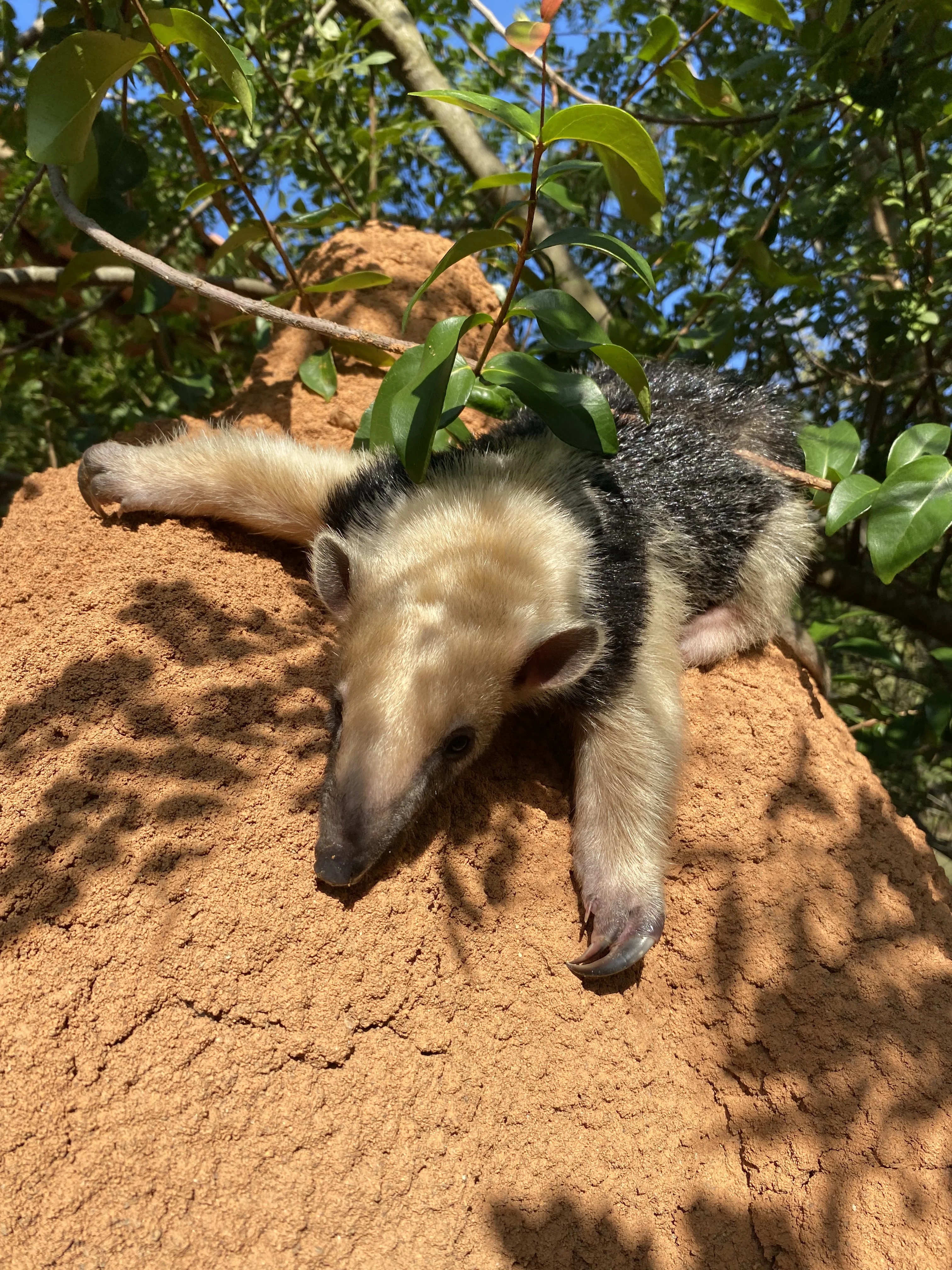 Com a evolução do quadro clínico, o filhote passou por uma transição alimentar gradual. “Com o ganho de peso, começamos a introduzir a alimentação sólida e também a estimular o comportamento natural. A gente levava cupinzeiro para que ele pudesse treinar essas habilidades, respeitando o tempo e as necessidades da espécie”, acrescenta a veterinária.