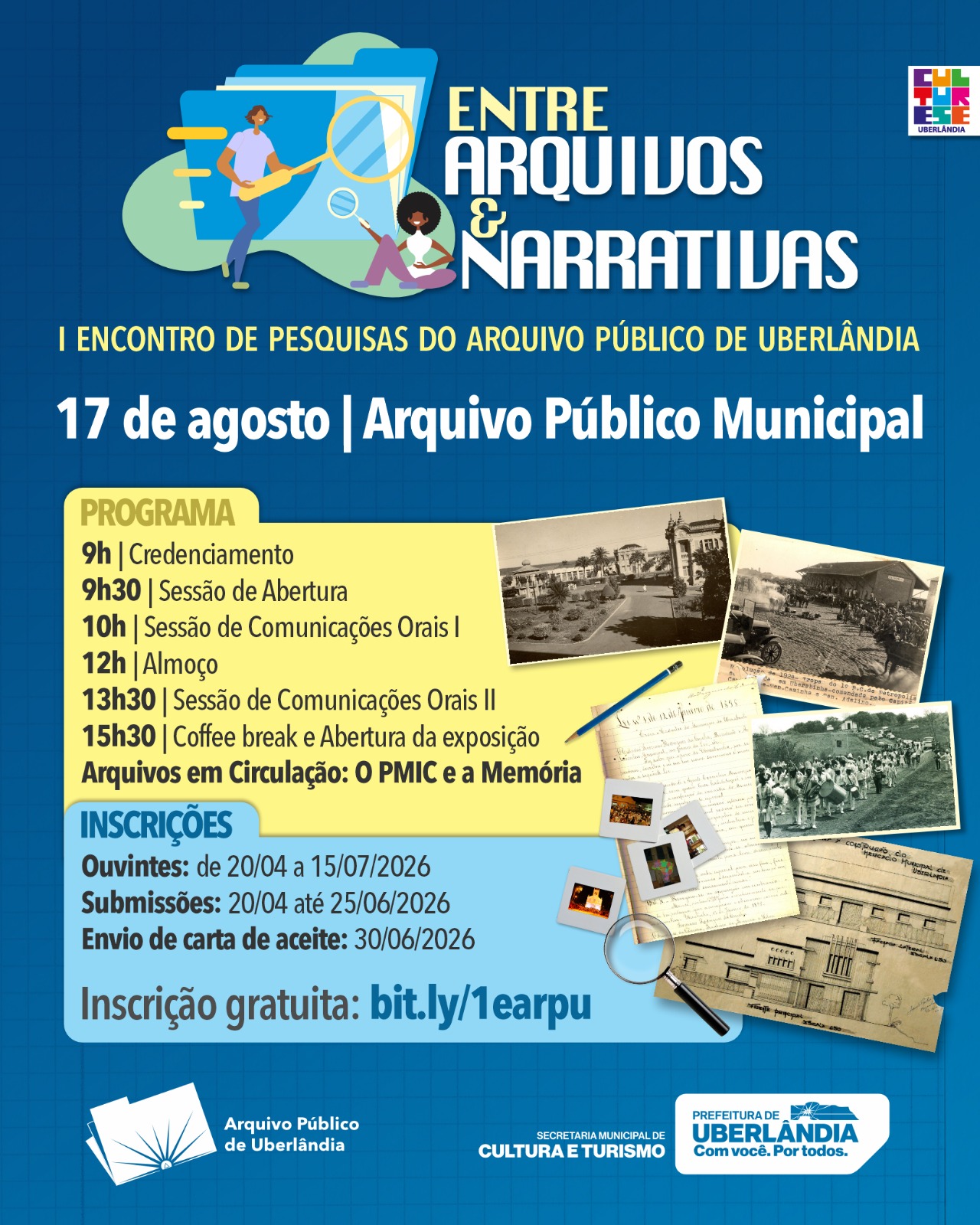 A Prefeitura de Uberlândia, por meio da Secretaria Municipal de Cultura e Turismo, realiza no dia 17 de agosto de 2026 o evento presencial e gratuito “Entre Arquivos e Narrativas I Encontro Anual de Pesquisas do Arquivo Público de Uberlândia”. A atividade acontecerá no Arquivo Público de Uberlândia e integra as comemorações do Dia Nacional do Patrimônio Histórico.