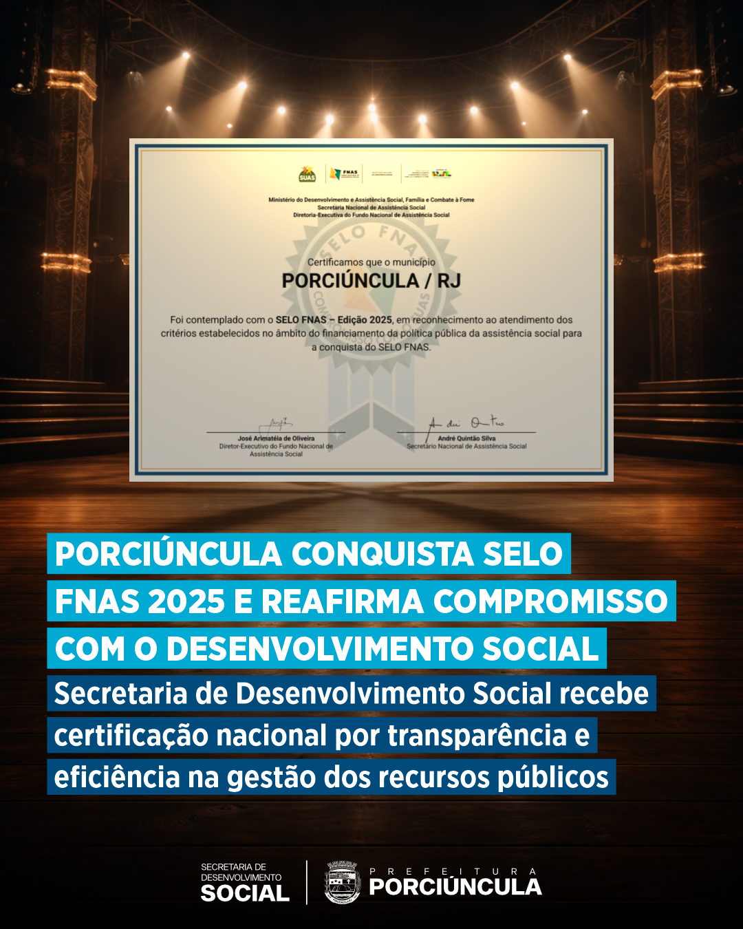 Porciúncula recebeu o Selo FNAS – Edição 2025, concedido pelo Fundo Nacional de Assistência Social, vinculado ao Ministério do Desenvolvimento e Assistência Social, Família e Combate à Fome. A certificação reconhece que o município atende aos critérios estabelecidos no âmbito do financiamento da política pública de assistência social, comprovando regularidade na prestação de contas e eficiência na aplicação dos recursos destinados à população.