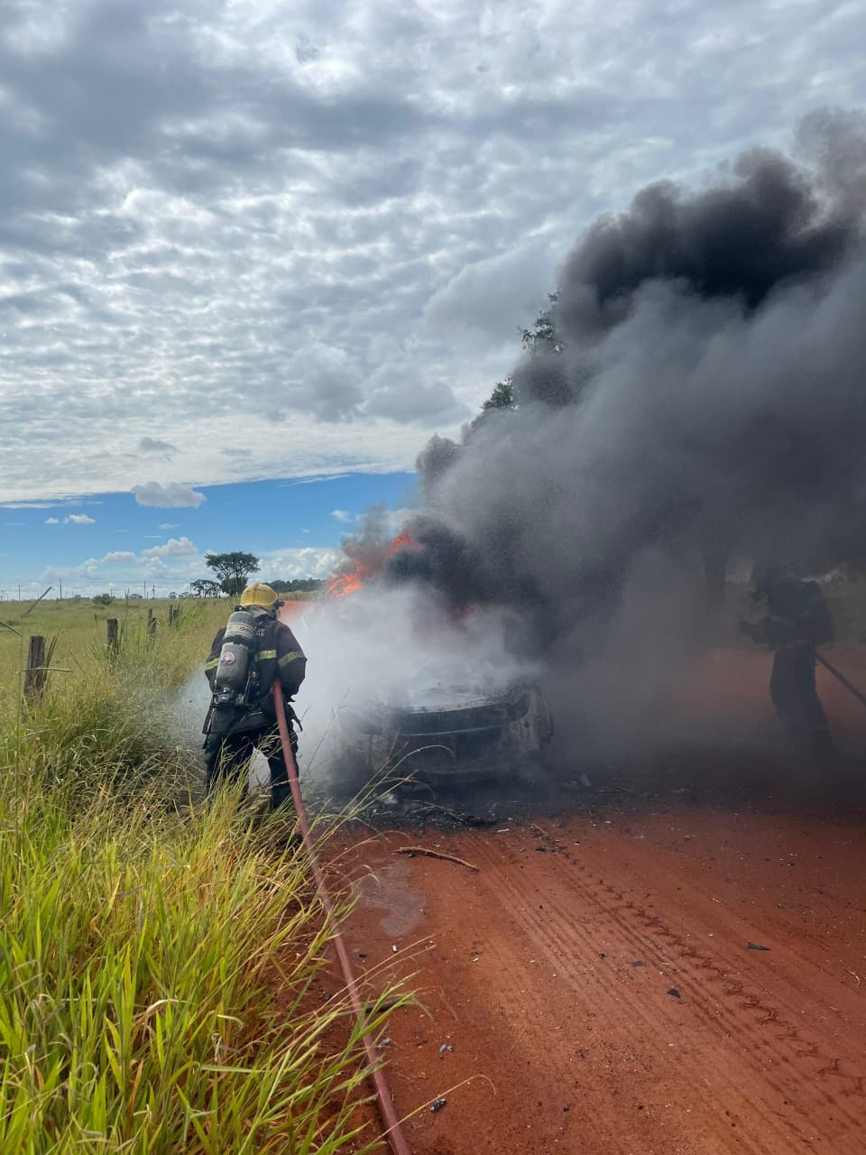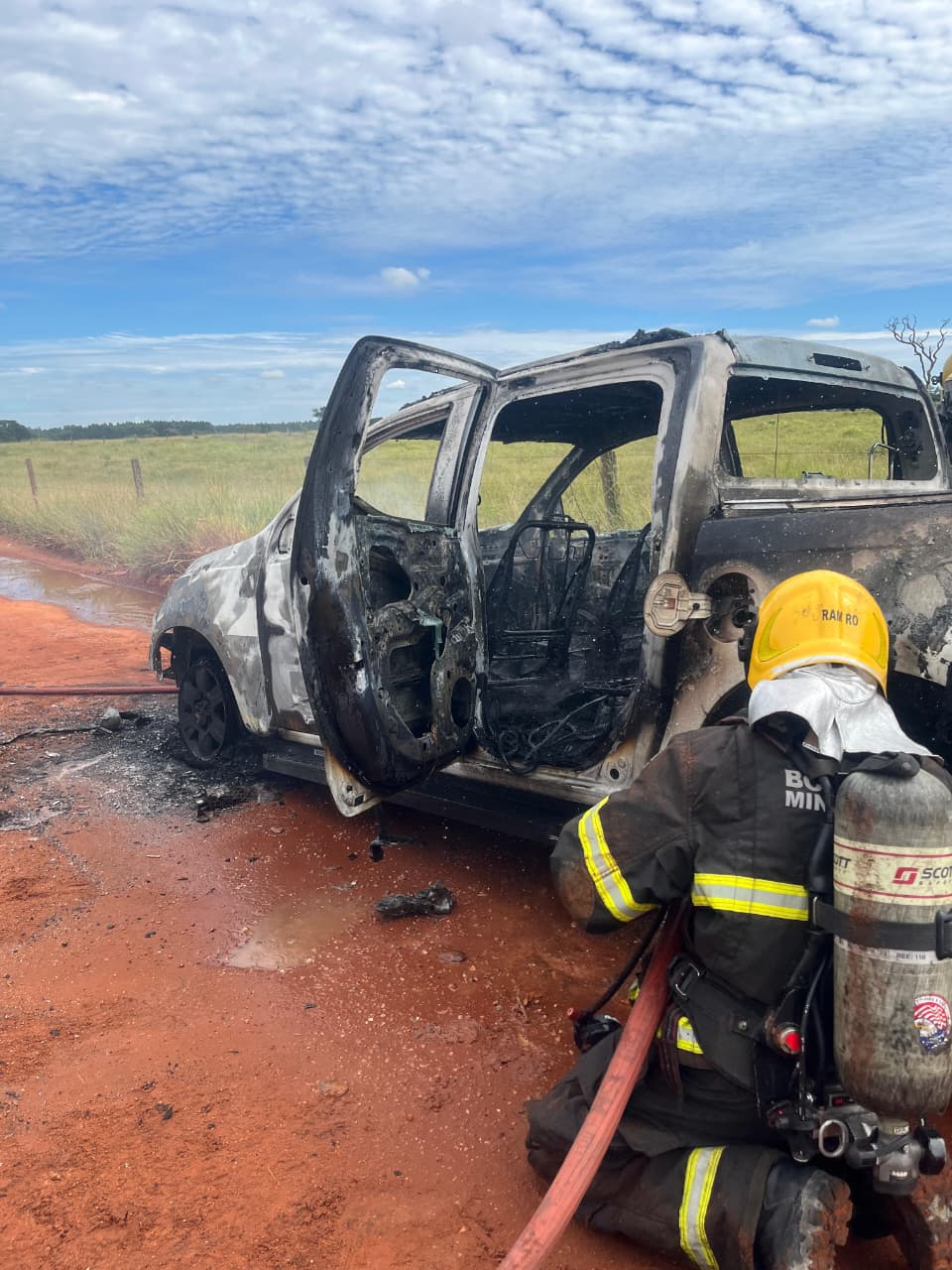 No local, tratava-se de uma caminhonete modelo S10. Segundo o proprietário, o veículo apresentava falhas no painel, com luzes indicativas da tração acesas, momento em que decidiu realizar um teste em estrada de terra. Durante o deslocamento, o veículo veio a se incendiar.